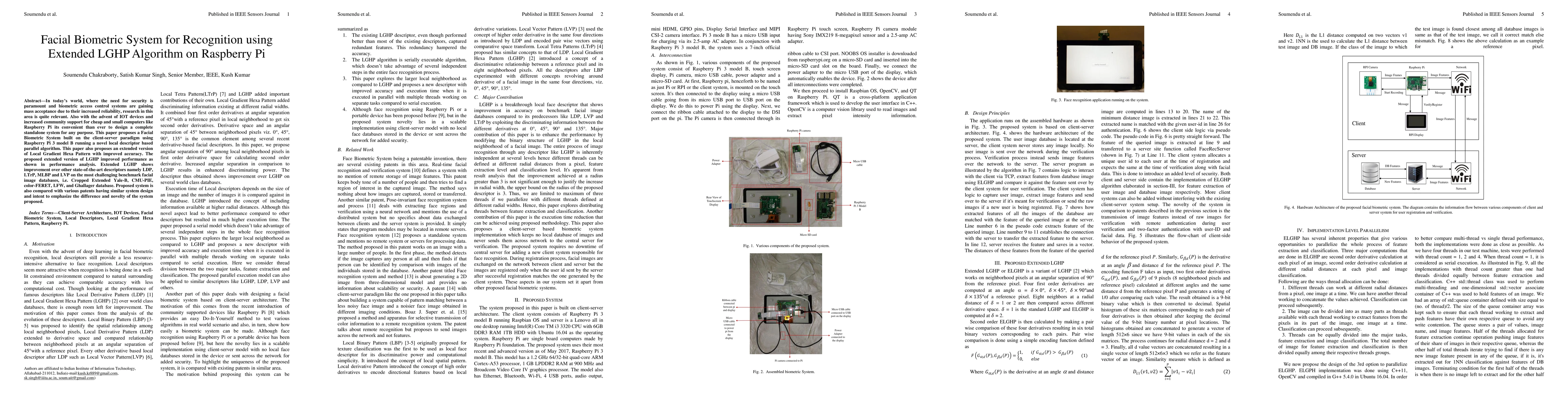 In todays world, where the need for security is paramount and biometric access control systems are gaining mass acceptance due to their increased reliability, research in this area is quite relevant. Also with the advent of IOT devices and increased community support for cheap and small computers like Raspberry Pi its convenient than ever to design a complete standalone system for any purpose. This paper proposes a Facial Biometric System built on the client-server paradigm using Raspberry Pi 3 model B running a novel local descriptor based parallel algorithm. This paper also proposes an extended version of Local Gradient Hexa Pattern with improved accuracy. The proposed extended version of LGHP improved performance as shown in performance analysis. Extended LGHP shows improvement over other state-of-the-art descriptors namely LDP, LTrP, MLBP and LVP on the most challenging benchmark facial image databases, i.e. Cropped Extended Yale-B, CMU-PIE, color-FERET, LFW, and Ghallager database. Proposed system is also compared with various patents having similar system design and intent to emphasize the difference and novelty of the system proposed.
