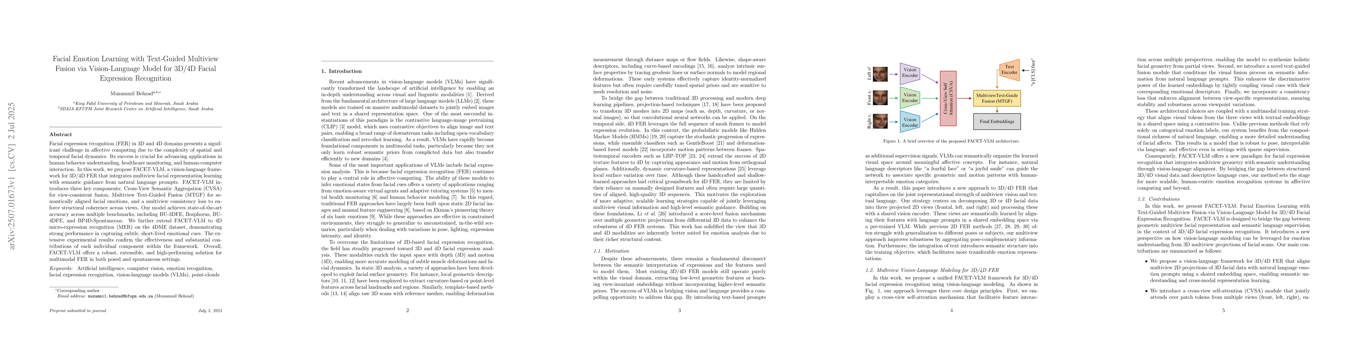 Facial expression recognition (FER) in 3D and 4D domains presents a significant challenge in affective computing due to the complexity of spatial and temporal facial dynamics. Its success is crucial for advancing applications in human behavior understanding, healthcare monitoring, and human-computer interaction. In this work, we propose FACET-VLM, a vision-language framework for 3D/4D FER that integrates multiview facial representation learning with semantic guidance from natural language prompts. FACET-VLM introduces three key components: Cross-View Semantic Aggregation (CVSA) for view-consistent fusion, Multiview Text-Guided Fusion (MTGF) for semantically aligned facial emotions, and a multiview consistency loss to enforce structural coherence across views. Our model achieves state-of-the-art accuracy across multiple benchmarks, including BU-3DFE, Bosphorus, BU-4DFE, and BP4D-Spontaneous. We further extend FACET-VLM to 4D micro-expression recognition (MER) on the 4DME dataset, demonstrating strong performance in capturing subtle, short-lived emotional cues. The extensive experimental results confirm the effectiveness and substantial contributions of each individual component within the framework. Overall, FACET-VLM offers a robust, extensible, and high-performing solution for multimodal FER in both posed and spontaneous settings.