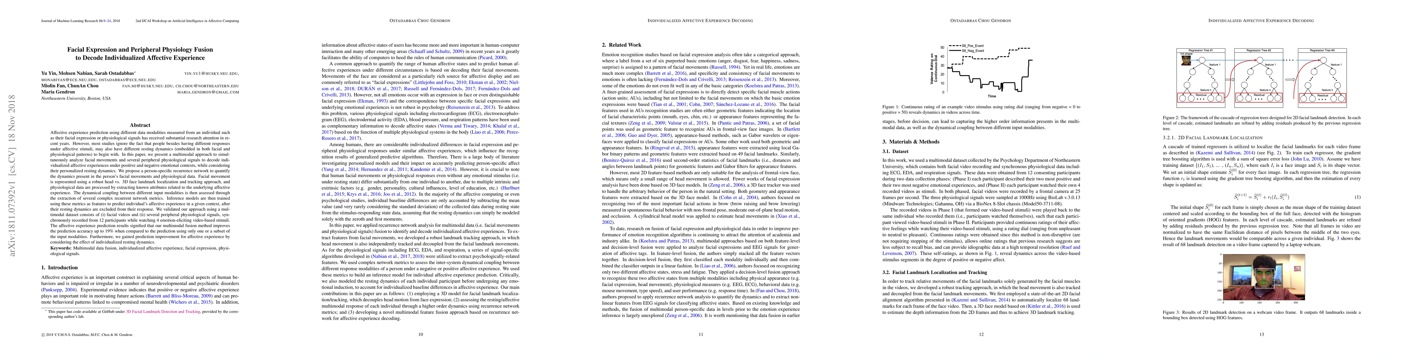 This paper proposes a multimodal approach combining facial expression analysis and peripheral physiological signals to decode individualized affective experiences. The method uses a person-specific recurrence network to quantify dynamics in facial and physiological data, improving affective experience prediction accuracy by up to 19% compared to single-modality approaches.