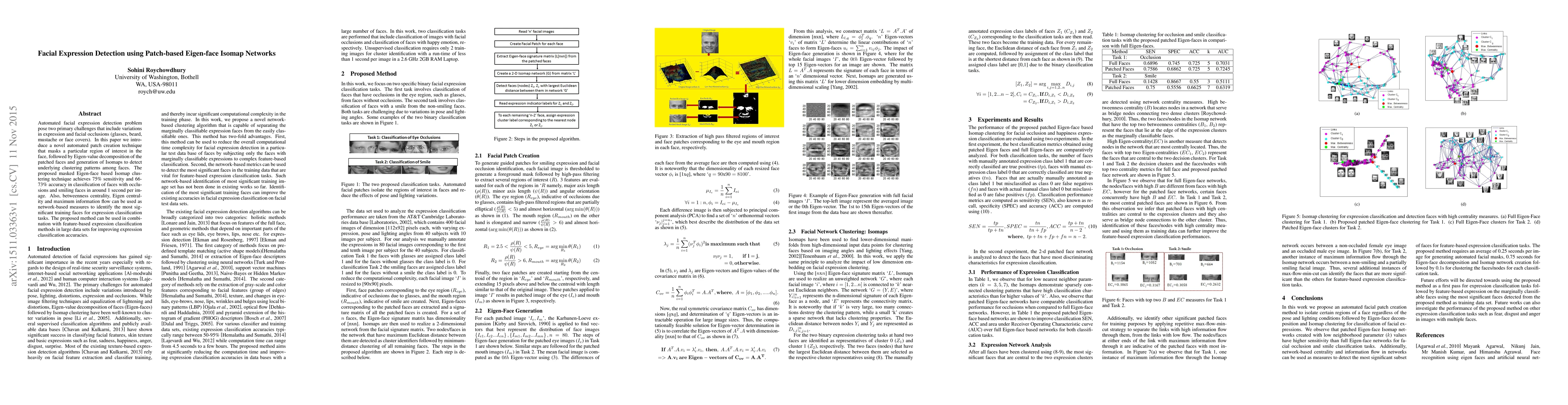 This paper proposes a novel patch-based Eigen-face Isomap network for automated facial expression detection, addressing challenges of expression variations and occlusions. The method achieves 75% sensitivity and 66-73% accuracy, and can enhance large dataset expression classification when combined with feature-based methods.