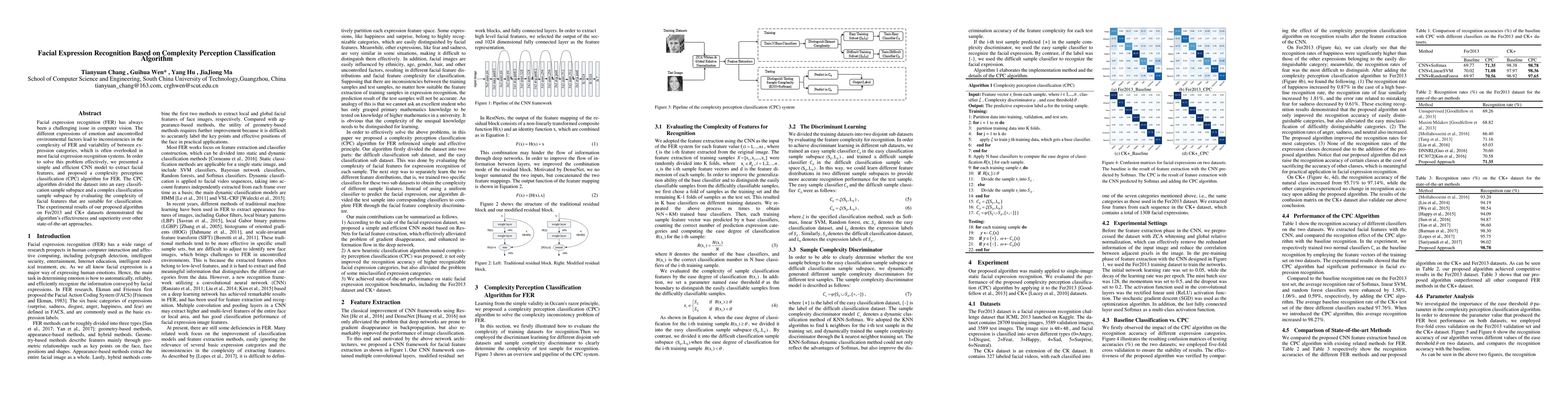 This paper introduces a CNN model for facial expression recognition (FER) and proposes a Complexity Perception Classification (CPC) algorithm that segments datasets into easy and complex subspaces based on facial feature complexity, showing superior performance on Fer2013 and CK-plus datasets compared to other methods.