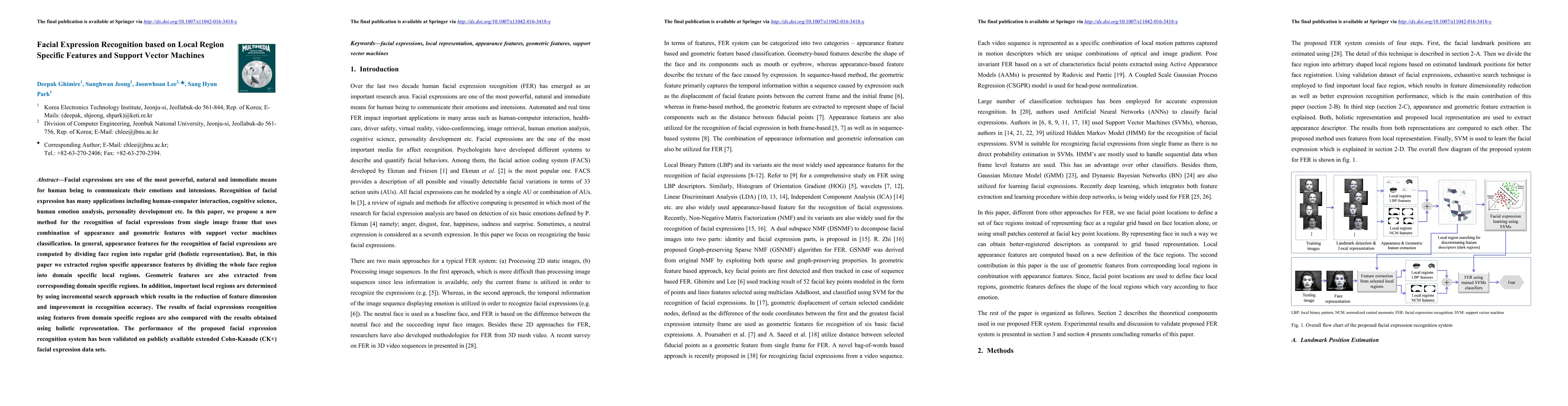 This paper proposes a novel method for facial expression recognition using local region-specific features and support vector machines. It extracts region-specific appearance and geometric features, reducing feature dimensions and improving accuracy compared to holistic representations, validated on the CK+ dataset.