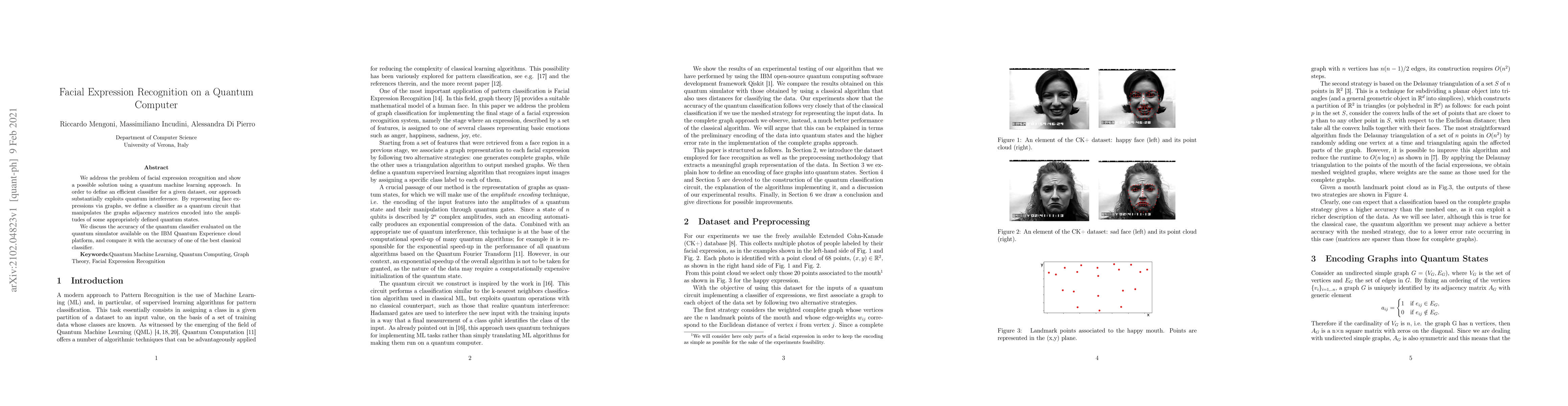 This research demonstrates facial expression recognition using quantum machine learning, leveraging quantum interference for efficient classification. The method represents expressions as graphs and uses quantum circuits to manipulate adjacency matrices, achieving accuracy comparable to classical classifiers on IBM's quantum simulator.