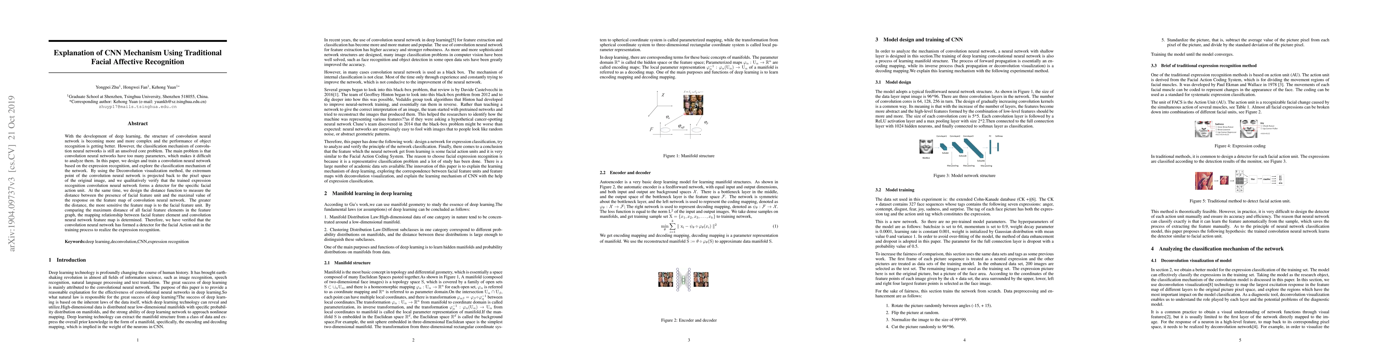 This paper develops a complex convolutional neural network (CNN) for facial expression recognition, addressing the core problem of CNN's classification mechanism. It utilizes deconvolution visualization to map network responses back to original image pixels, showing the network acts as a detector for specific facial action units, and introduces a distance function to quantify the sensitivity of feature maps to facial features, confirming the CNN's effectiveness in expression recognition.