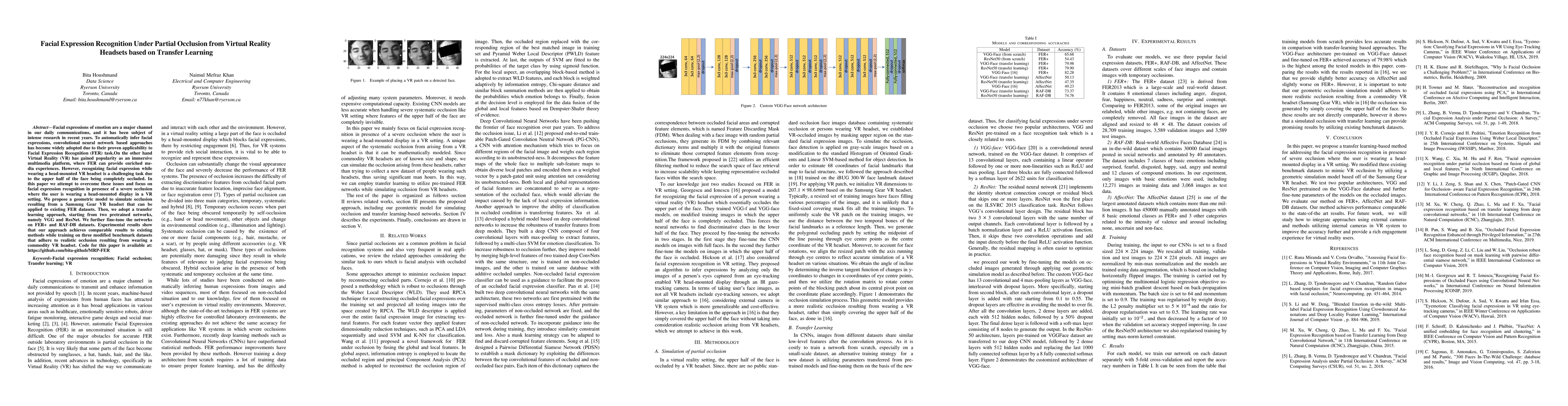 This paper proposes a transfer learning approach to enhance facial expression recognition (FER) under partial occlusion from VR headsets. It simulates occlusion from a Samsung Gear VR headset and fine-tunes pretrained VGG and ResNet networks on modified FER datasets, achieving comparable results to existing methods.