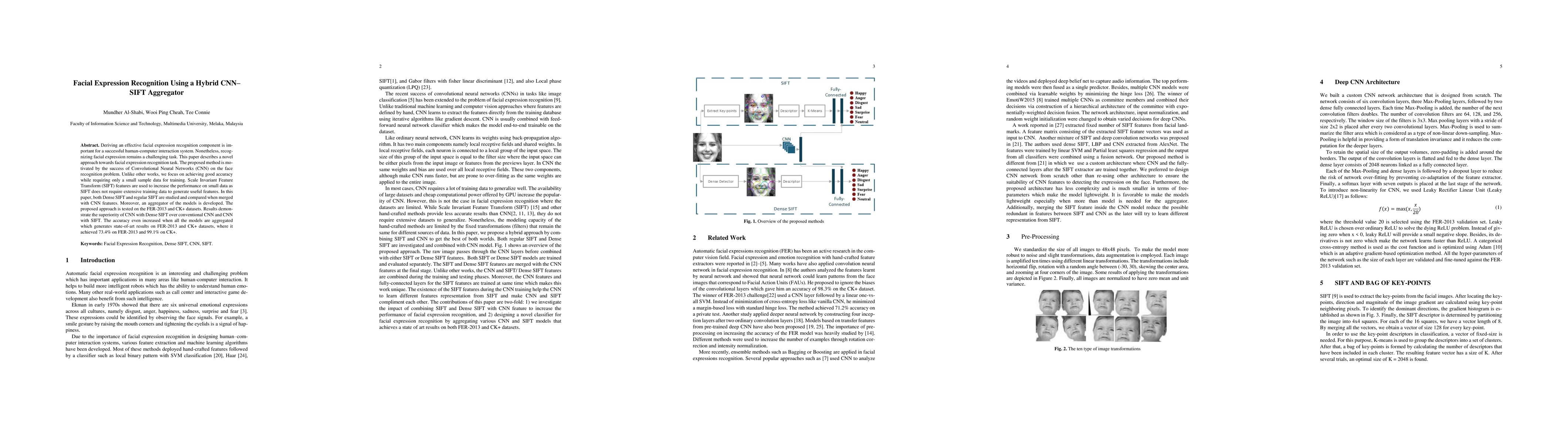 This paper proposes a hybrid CNN-SIFT aggregator for facial expression recognition, achieving high accuracy with minimal training data. The integration of Dense SIFT with CNN features outperforms traditional CNN and SIFT methods, with aggregated models achieving state-of-the-art results of 73.4% on FER-2013 and 99.1% on CK+.