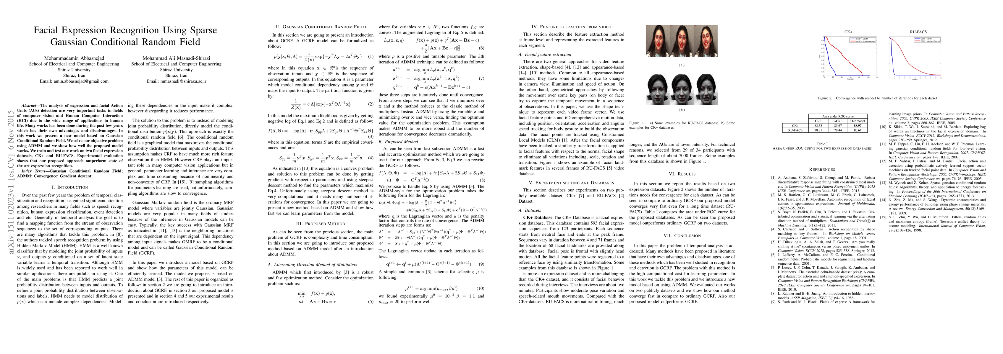 This paper proposes a new facial expression recognition model based on Gaussian Conditional Random Fields, optimized using ADMM, which outperforms existing methods on CK+ and RU-FACS datasets. The approach demonstrates superior performance in detecting facial Action Units for applications in computer vision and Human-Computer Interaction.
