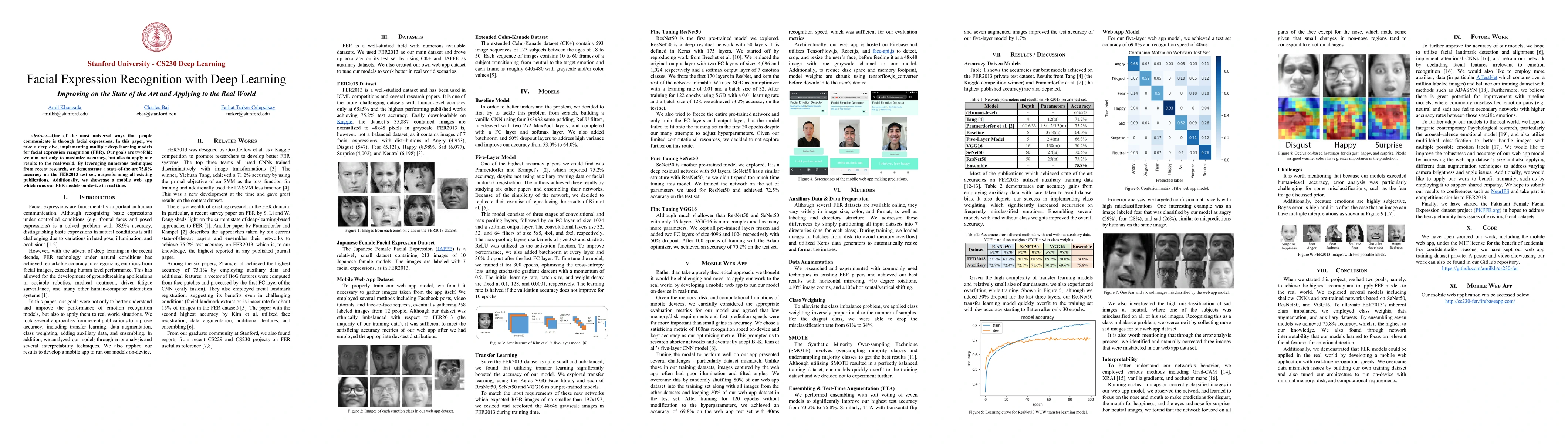 This research paper explores deep learning models for facial expression recognition, achieving a top accuracy of 75.8% on the FER2013 dataset, surpassing previous results. It also demonstrates a mobile web app that runs the models in real-time on-device.