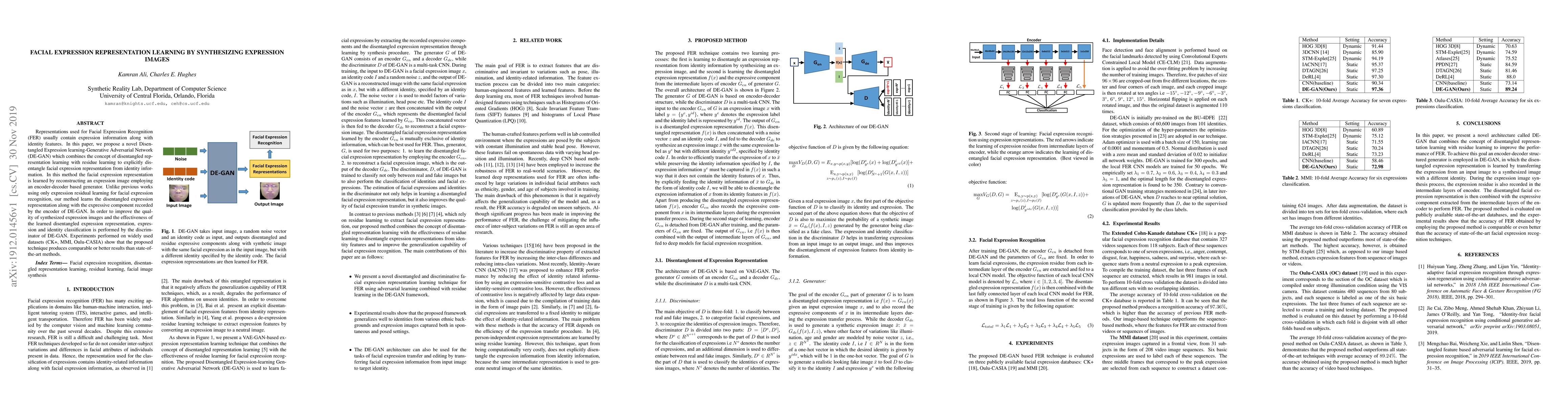 This paper proposes a Disentangled Expression learning-Generative Adversarial Network (DE-GAN) to disentangle facial expression representation from identity information in Facial Expression Recognition (FER). The method synthesizes expression images and employs an encoder-decoder generator to learn disentangled representations, achieving better or comparable results to state-of-the-art methods on multiple datasets.