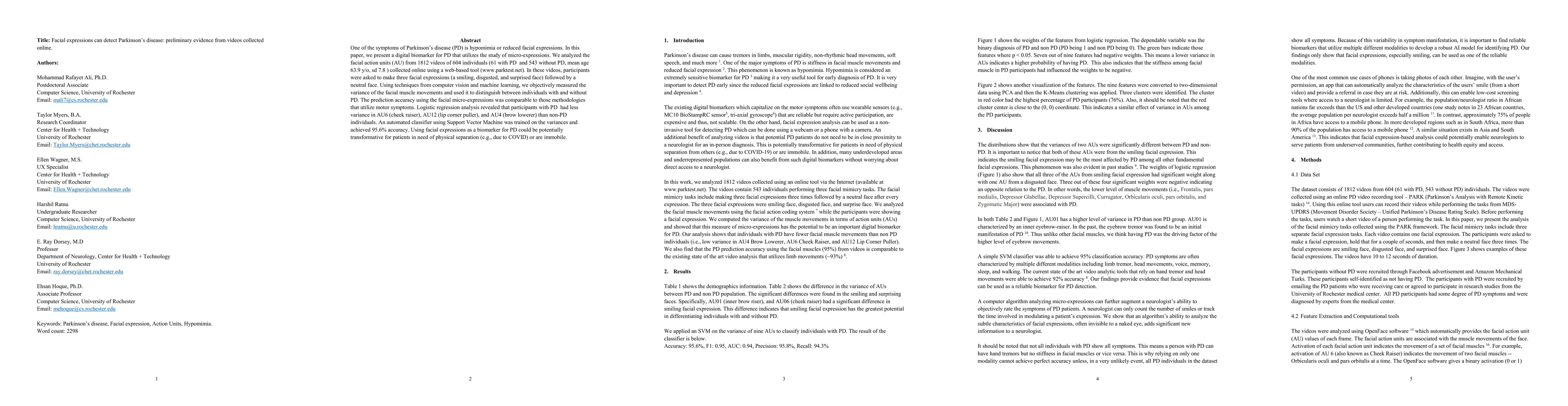 This study proposes a digital biomarker for Parkinson's disease using facial micro-expressions, finding reduced variance in specific facial muscle movements in PD patients. An automated classifier achieved 95.6% accuracy, suggesting facial expressions could be a valuable diagnostic tool, especially for remote or immobile patients.