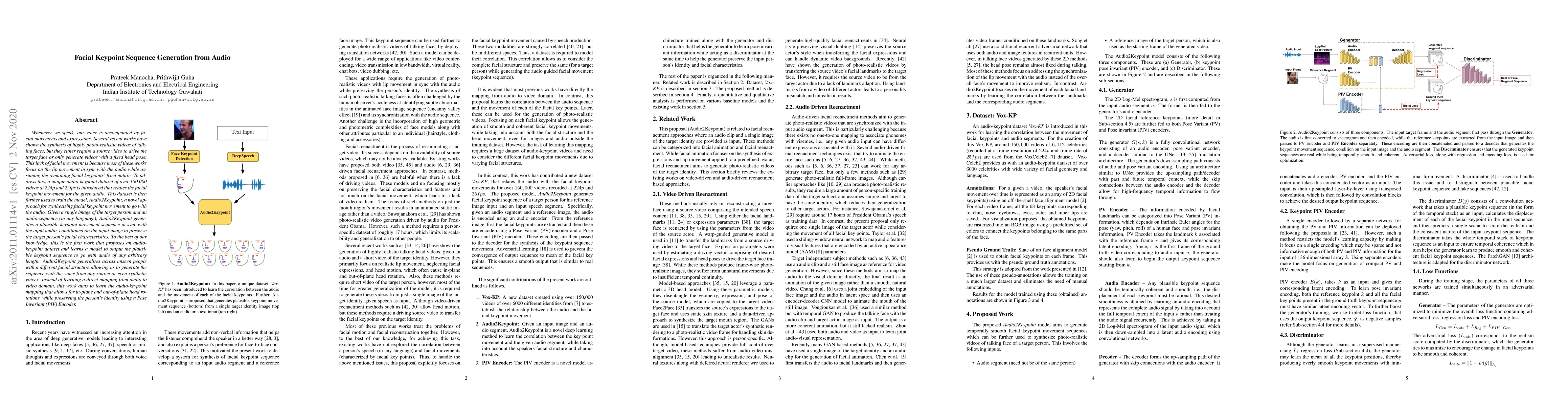 Whenever we speak, our voice is accompanied by facial movements and expressions. Several recent works have shown the synthesis of highly photo-realistic videos of talking faces, but they either require a source video to drive the target face or only generate videos with a fixed head pose. This lack of facial movement is because most of these works focus on the lip movement in sync with the audio while assuming the remaining facial keypoints' fixed nature. To address this, a unique audio-keypoint dataset of over 150,000 videos at 224p and 25fps is introduced that relates the facial keypoint movement for the given audio. This dataset is then further used to train the model, Audio2Keypoint, a novel approach for synthesizing facial keypoint movement to go with the audio. Given a single image of the target person and an audio sequence (in any language), Audio2Keypoint generates a plausible keypoint movement sequence in sync with the input audio, conditioned on the input image to preserve the target person's facial characteristics. To the best of our knowledge, this is the first work that proposes an audio-keypoint dataset and learns a model to output the plausible keypoint sequence to go with audio of any arbitrary length. Audio2Keypoint generalizes across unseen people with a different facial structure allowing us to generate the sequence with the voice from any source or even synthetic voices. Instead of learning a direct mapping from audio to video domain, this work aims to learn the audio-keypoint mapping that allows for in-plane and out-of-plane head rotations, while preserving the person's identity using a Pose Invariant (PIV) Encoder.