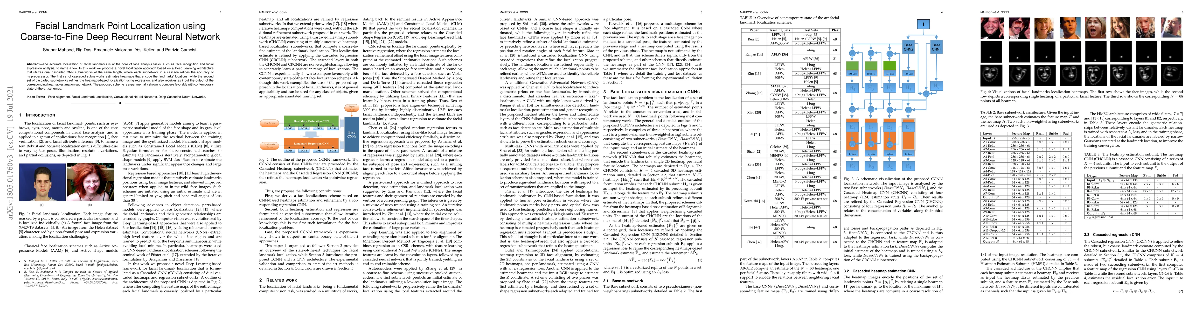 This paper proposes a deep learning method for facial landmarks localization using cascaded neural networks, which first estimates heatmaps and then refines them through regression, outperforming contemporary state-of-the-art methods, particularly under challenging conditions.