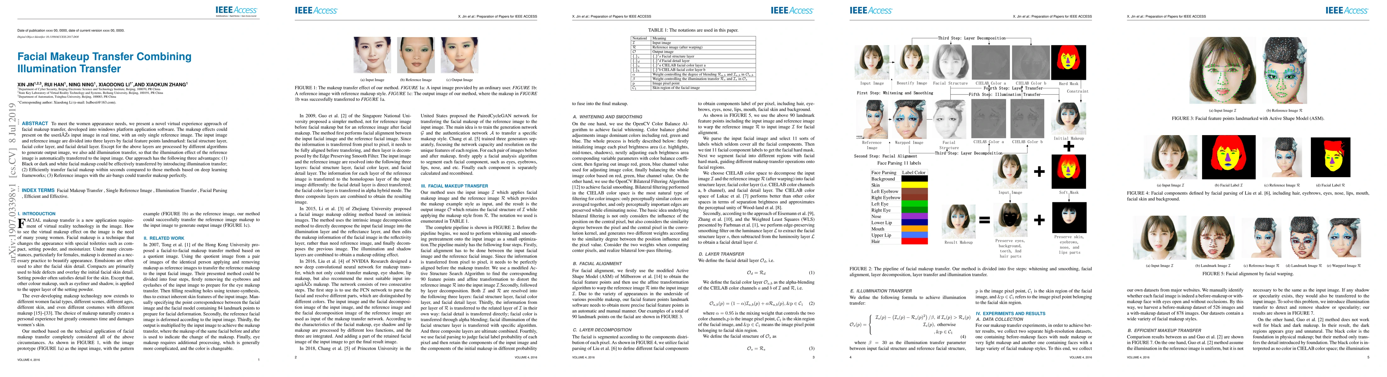 To meet the women appearance needs, we present a novel virtual experience approach of facial makeup transfer, developed into windows platform application software. The makeup effects could present on the user's input image in real time, with an only single reference image. The input image and reference image are divided into three layers by facial feature points landmarked: facial structure layer, facial color layer, and facial detail layer. Except for the above layers are processed by different algorithms to generate output image, we also add illumination transfer, so that the illumination effect of the reference image is automatically transferred to the input image. Our approach has the following three advantages: (1) Black or dark and white facial makeup could be effectively transferred by introducing illumination transfer; (2) Efficiently transfer facial makeup within seconds compared to those methods based on deep learning frameworks; (3) Reference images with the air-bangs could transfer makeup perfectly.