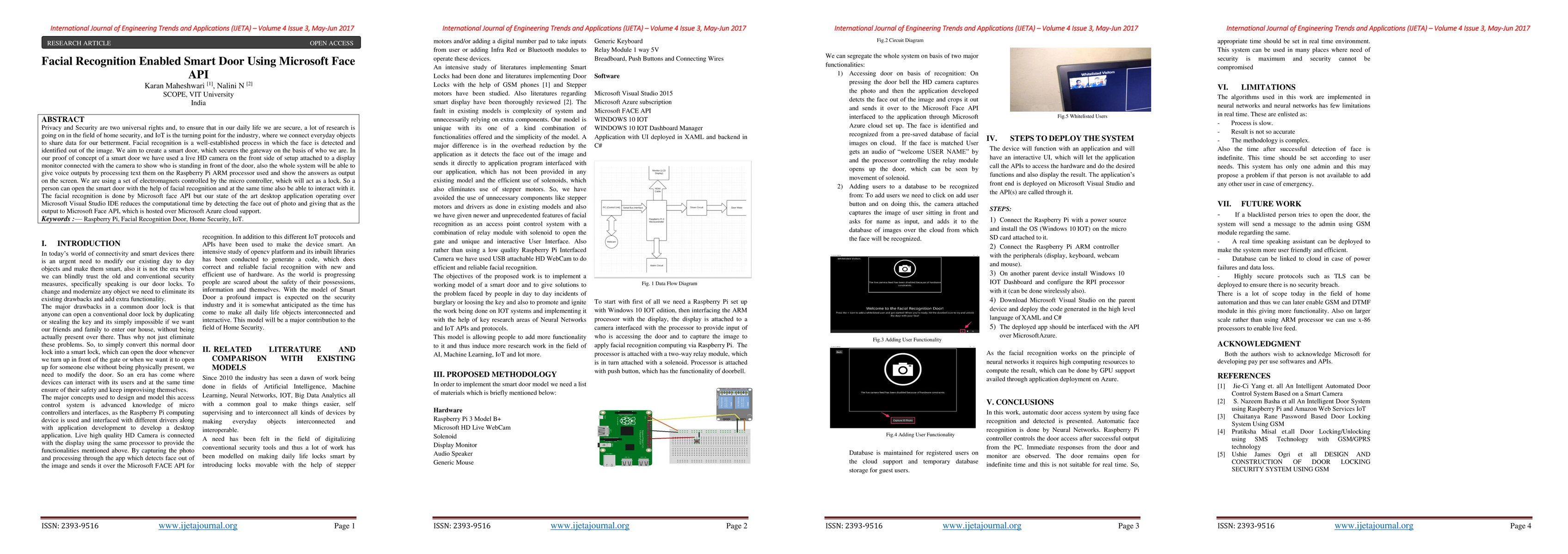 Privacy and Security are two universal rights and, to ensure that in our daily life we are secure, a lot of research is going on in the field of home security, and IoT is the turning point for the industry, where we connect everyday objects to share data for our betterment. Facial recognition is a well-established process in which the face is detected and identified out of the image. We aim to create a smart door, which secures the gateway on the basis of who we are. In our proof of concept of a smart door we have used a live HD camera on the front side of setup attached to a display monitor connected to the camera to show who is standing in front of the door, also the whole system will be able to give voice outputs by processing text them on the Raspberry Pi ARM processor used and show the answers as output on the screen. We are using a set of electromagnets controlled by the microcontroller, which will act as a lock. So a person can open the smart door with the help of facial recognition and at the same time also be able to interact with it. The facial recognition is done by Microsoft face API but our state of the art desktop application operating over Microsoft Visual Studio IDE reduces the computational time by detecting the face out of the photo and giving that as the output to Microsoft Face API, which is hosted over Microsoft Azure cloud support.