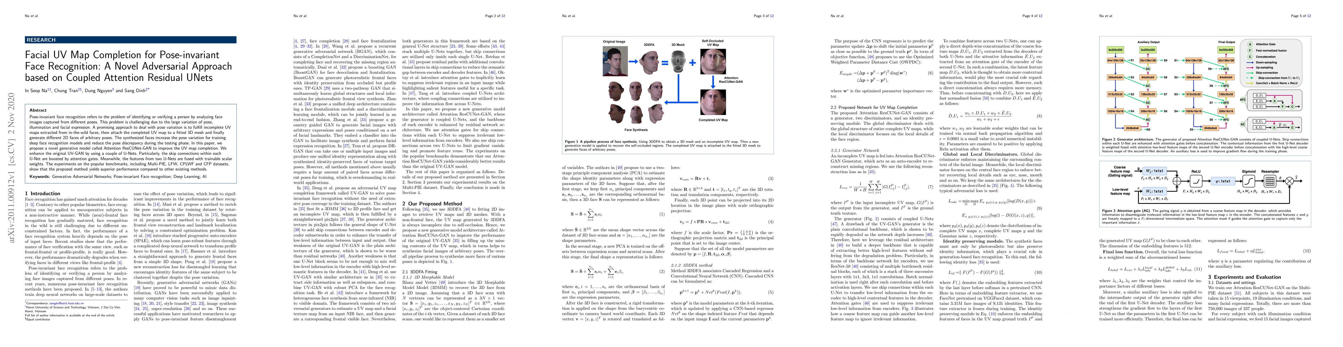 Pose-invariant face recognition refers to the problem of identifying or verifying a person by analyzing face images captured from different poses. This problem is challenging due to the large variation of pose, illumination and facial expression. A promising approach to deal with pose variation is to fulfill incomplete UV maps extracted from in-the-wild faces, then attach the completed UV map to a fitted 3D mesh and finally generate different 2D faces of arbitrary poses. The synthesized faces increase the pose variation for training deep face recognition models and reduce the pose discrepancy during the testing phase. In this paper, we propose a novel generative model called Attention ResCUNet-GAN to improve the UV map completion. We enhance the original UV-GAN by using a couple of U-Nets. Particularly, the skip connections within each U-Net are boosted by attention gates. Meanwhile, the features from two U-Nets are fused with trainable scalar weights. The experiments on the popular benchmarks, including Multi-PIE, LFW, CPLWF and CFP datasets, show that the proposed method yields superior performance compared to other existing methods.