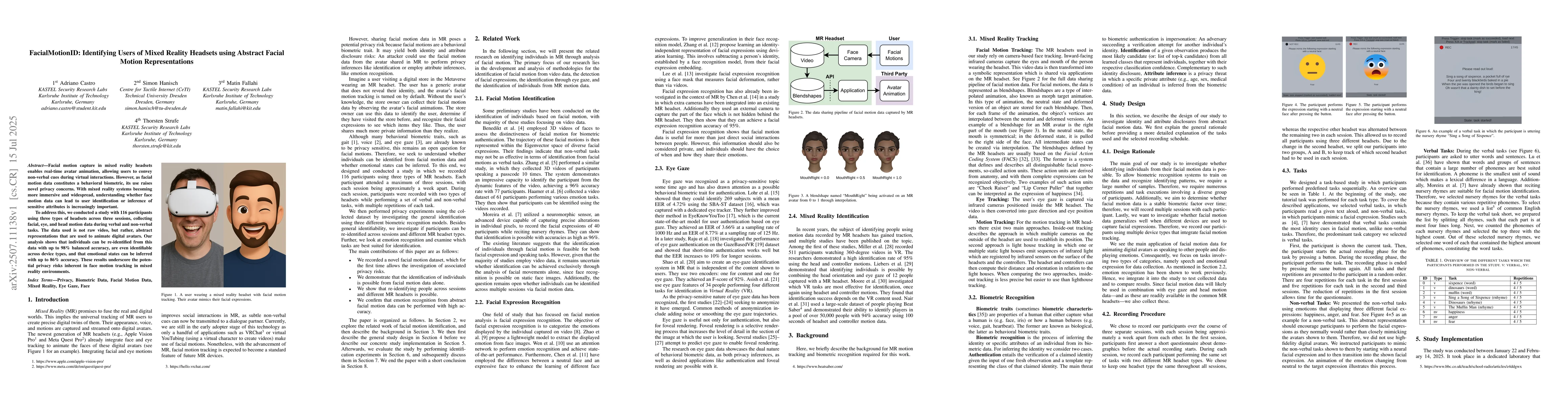 Facial motion capture in mixed reality headsets enables real-time avatar animation, allowing users to convey non-verbal cues during virtual interactions. However, as facial motion data constitutes a behavioral biometric, its use raises novel privacy concerns. With mixed reality systems becoming more immersive and widespread, understanding whether face motion data can lead to user identification or inference of sensitive attributes is increasingly important. To address this, we conducted a study with 116 participants using three types of headsets across three sessions, collecting facial, eye, and head motion data during verbal and non-verbal tasks. The data used is not raw video, but rather, abstract representations that are used to animate digital avatars. Our analysis shows that individuals can be re-identified from this data with up to 98% balanced accuracy, are even identifiable across device types, and that emotional states can be inferred with up to 86% accuracy. These results underscore the potential privacy risks inherent in face motion tracking in mixed reality environments.