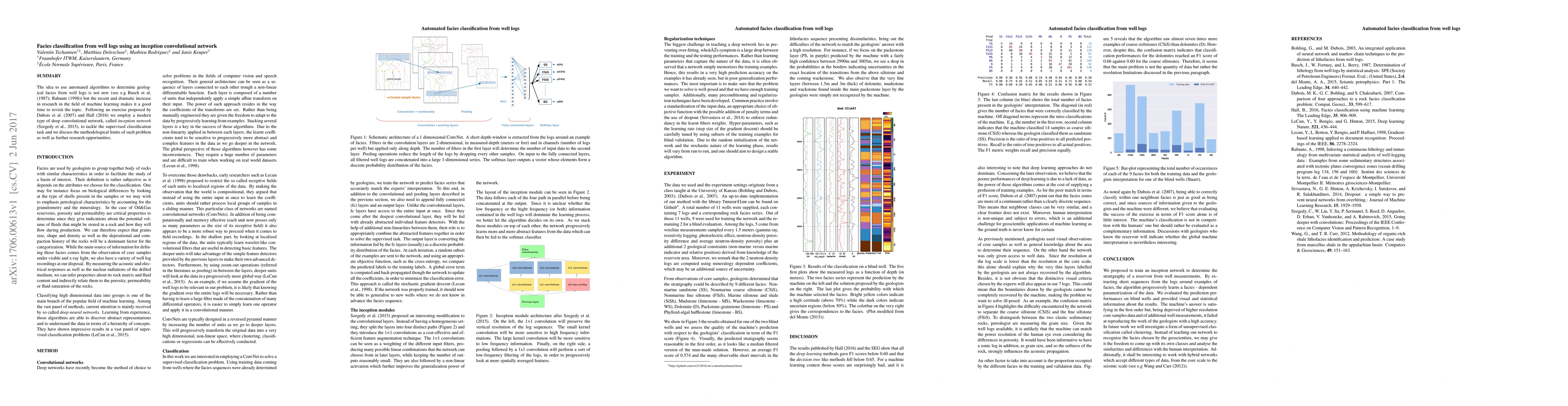 The idea to use automated algorithms to determine geological facies from well logs is not new (see e.g Busch et al. (1987); Rabaute (1998)) but the recent and dramatic increase in research in the field of machine learning makes it a good time to revisit the topic. Following an exercise proposed by Dubois et al. (2007) and Hall (2016) we employ a modern type of deep convolutional network, called \textit{inception network} (Szegedy et al., 2015), to tackle the supervised classification task and we discuss the methodological limits of such problem as well as further research opportunities.