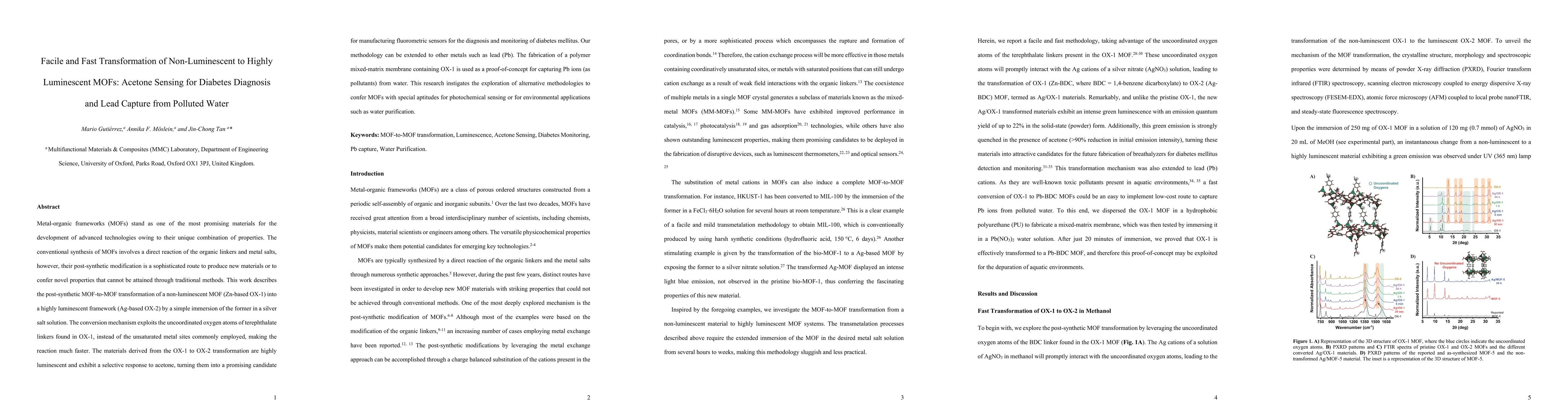Metal-organic frameworks (MOFs) stand as one of the most promising materials for the development of advanced technologies owing to their unique combination of properties. The conventional synthesis of MOFs involves a direct reaction of the organic linkers and metal salts, however, their post-synthetic modification is a sophisticated route to produce new materials or to confer novel properties that cannot be attained through traditional methods. This work describes the post-synthetic MOF-to-MOF transformation of a non-luminescent MOF (Zn-based OX-1) into a highly luminescent framework (Ag-based OX-2) by a simple immersion of the former in a silver salt solution. The conversion mechanism exploits the uncoordinated oxygen atoms of terephthalate linkers found in OX-1, instead of the unsaturated metal sites commonly employed, making the reaction much faster. The materials derived from the OX-1 to OX-2 transformation are highly luminescent and exhibit a selective response to acetone, turning them into a promising candidate for manufacturing fluorometric sensors for the diagnosis and monitoring of diabetes mellitus. Our methodology can be extended to other metals such as lead (Pb). The fabrication of a polymer mixed-matrix membrane containing OX-1 is used as a proof-of-concept for capturing Pb ions (as pollutants) from water. This research instigates the exploration of alternative methodologies to confer MOFs with special aptitudes for photochemical sensing or for environmental applications such as water purification.