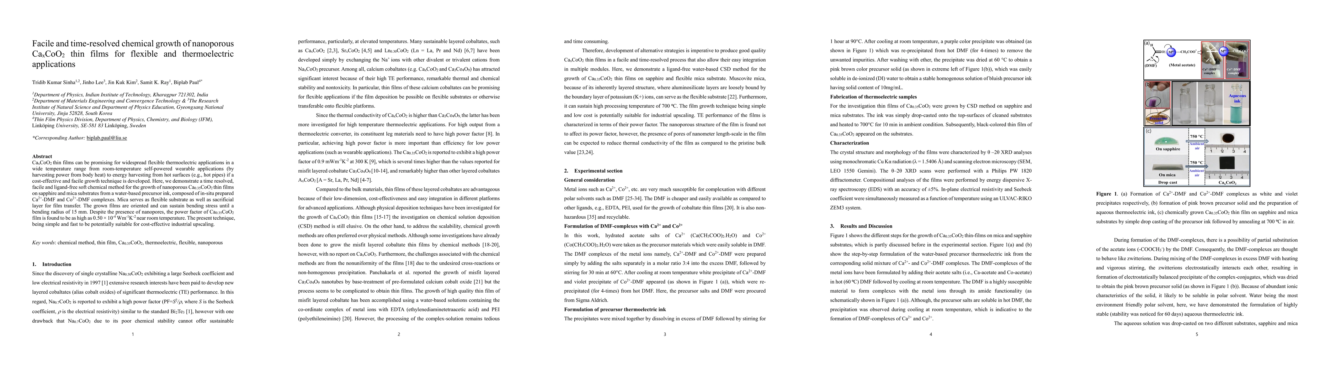 This paper presents a simple, time-resolved chemical method for growing nanoporous CaxCoO2 thin films on flexible substrates, demonstrating their potential for cost-effective flexible thermoelectric applications. The films exhibit high power factor and mechanical flexibility, making them suitable for wearable and surface energy harvesting devices.