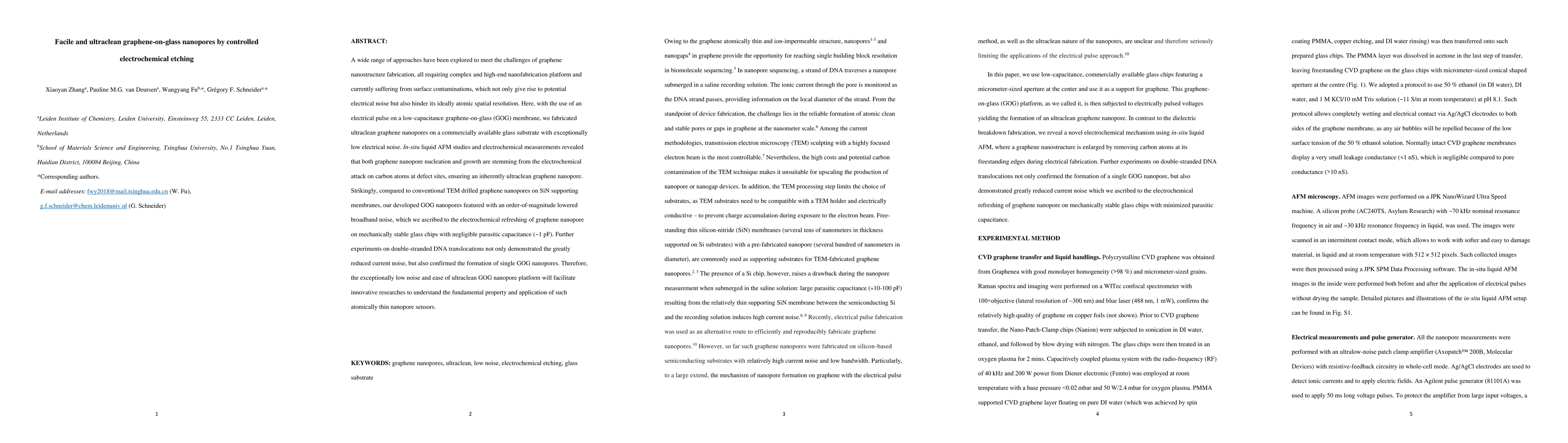 This paper presents a simple electrochemical method for creating ultraclean graphene nanopores on glass substrates with minimal electrical noise, achieved by using an electrical pulse on graphene-on-glass membranes. The low noise and reduced current fluctuations during double-stranded DNA translocations indicate the potential of these nanopores for high-precision sensor applications.