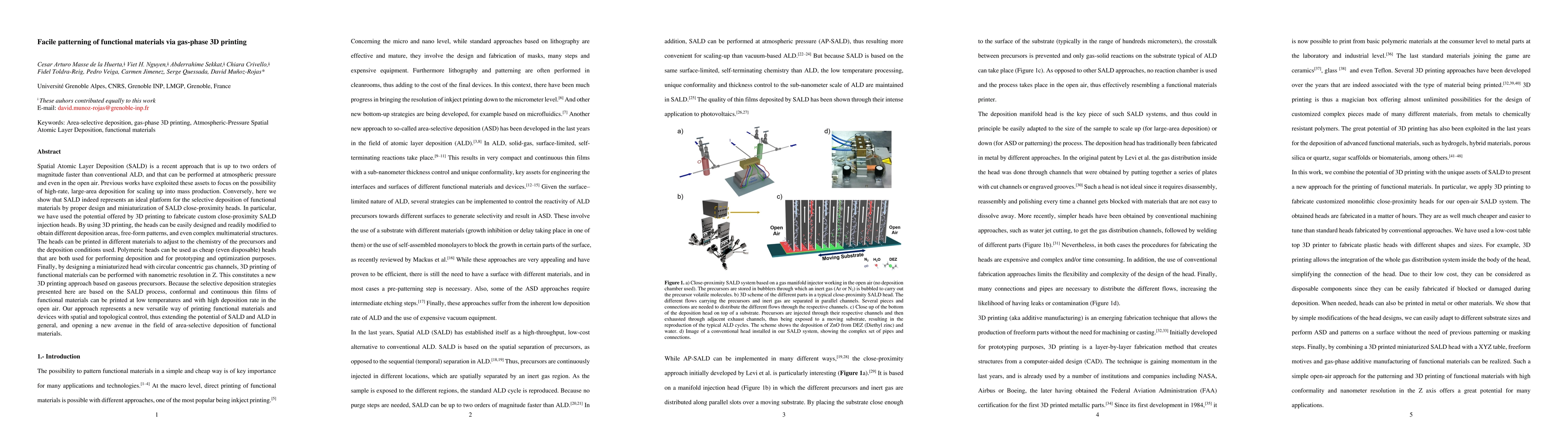 This paper demonstrates the use of Spatial Atomic Layer Deposition (SALD) via gas-phase 3D printing for the selective deposition of functional materials. By employing 3D printing to fabricate custom SALD heads, the authors achieve high-resolution, low-temperature conformal thin films, and complex multimaterial structures, thus expanding the versatility and application potential of SALD and Atomic Layer Deposition.
