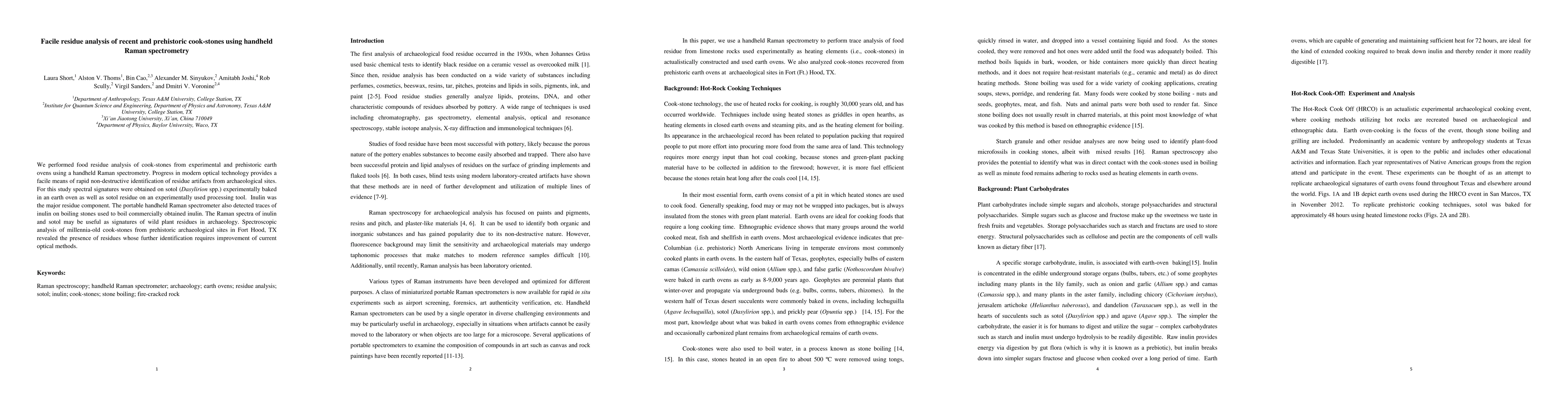 We performed food residue analysis of cook-stones from experimental and prehistoric earth ovens using a handheld Raman spectrometry. Progress in modern optical technology provides a facile means of rapid non-destructive identification of residue artifacts from archaeological sites. For this study spectral signatures were obtained on sotol (Dasylirion spp.) experimentally baked in an earth oven as well as sotol residue on an experimentally used processing tool. Inulin was the major residue component. The portable handheld Raman spectrometer also detected traces of inulin on boiling stones used to boil commercially obtained inulin. The Raman spectra of inulin and sotol may be useful as signatures of wild plant residues in archaeology. Spectroscopic analysis of millennia-old cook-stones from prehistoric archaeological sites in Fort Hood, TX revealed the presence of residues whose further identification requires improvement of current optical methods.