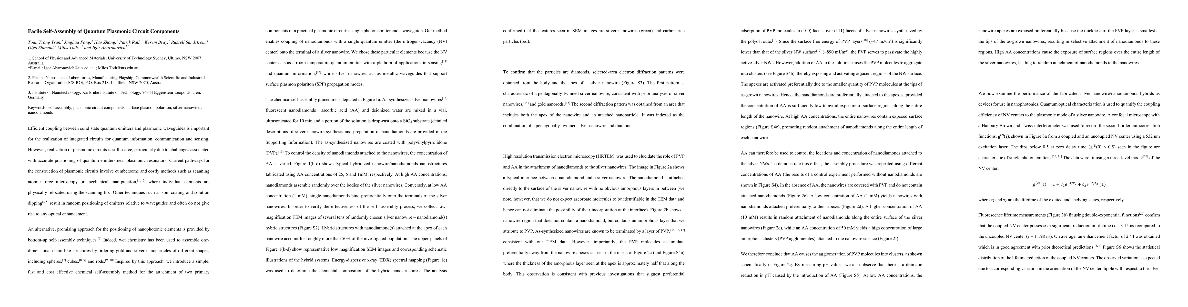 This paper presents a simple, cost-effective self-assembly method for integrating quantum emitters with plasmonic waveguides, overcoming the challenges of precise positioning. The method uses chemical self-assembly to attach nanodiamonds with nitrogen-vacancy centers onto silver nanowire tips, achieving efficient plasmonic coupling evidenced by reduced fluorescence lifetime and increased intensity.