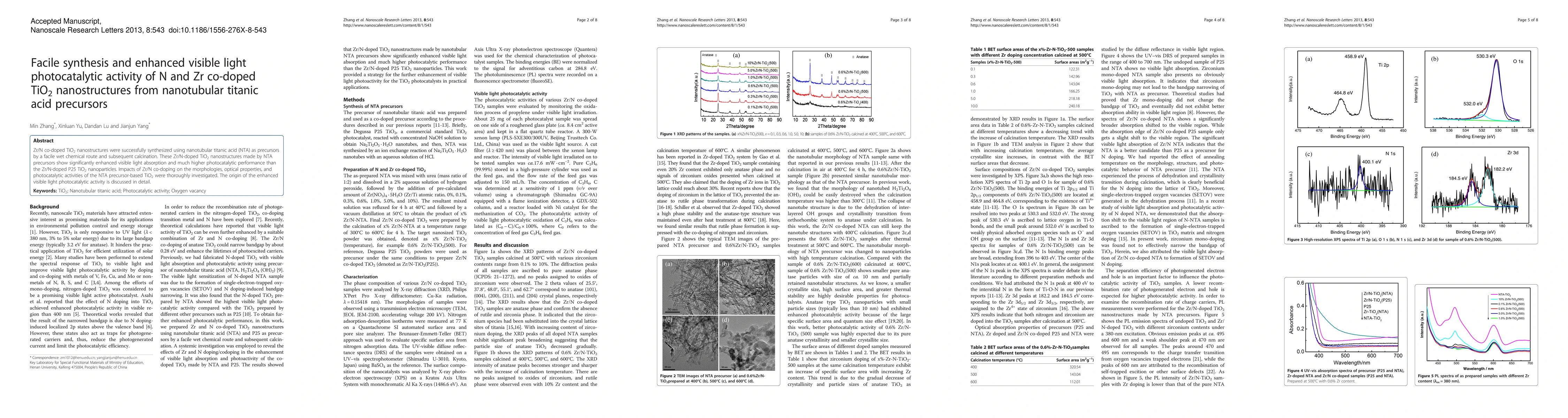 Zr/N co-doped TiO2 nanostructures were successfully synthesized using nanotubular titanic acid (NTA) as precursors by a facile wet chemical route and subsequent calcination. These Zr/N-doped TiO2 nanostructures made by NTA precursors show significantly enhanced visible light absorption and much higher photocatalytic performance than the Zr/N-doped P25 TiO2 nanoparticles. Impacts of Zr/N co-doping on the morphologies, optical properties, and photocatalytic activities of the NTA precursor-based TiO2 were thoroughly investigated. The origin of the enhanced visible light photocatalytic activity is discussed in detail.