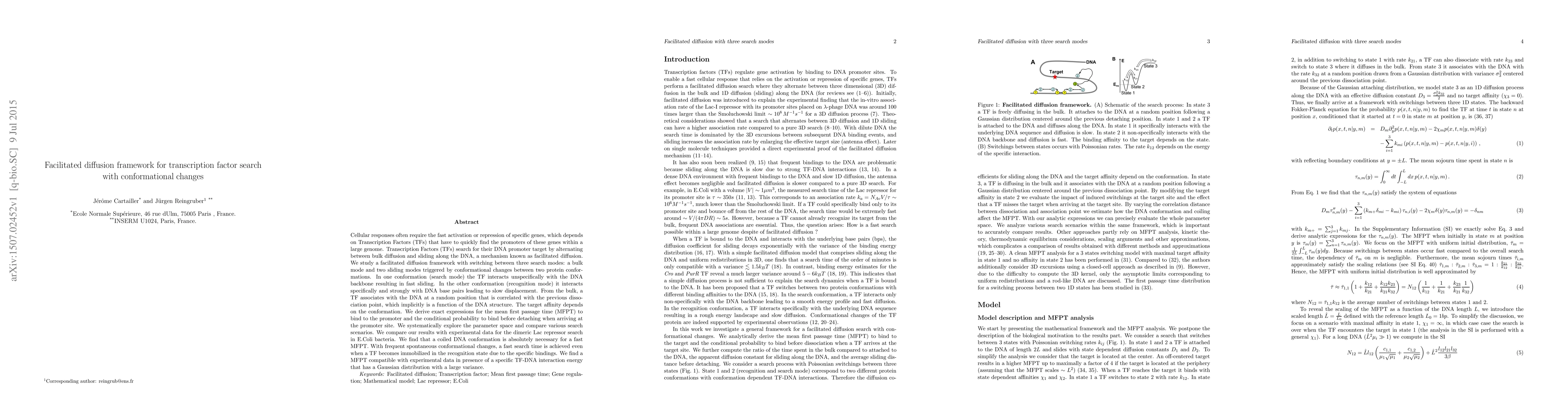 Cellular responses often require the fast activation or repression of specific genes, which depends on Transcription Factors (TFs) that have to quickly find the promoters of these genes within a large genome. Transcription Factors (TFs) search for their DNA promoter target by alternating between bulk diffusion and sliding along the DNA, a mechanism known as facilitated diffusion. We study a facilitated diffusion framework with switching between three search modes: a bulk mode and two sliding modes triggered by conformational changes between two protein conformations. In one conformation (search mode) the TF interacts unspecifically with the DNA backbone resulting in fast sliding. In the other conformation (recognition mode) it interacts specifically and strongly with DNA base pairs leading to slow displacement. From the bulk, a TF associates with the DNA at a random position that is correlated with the previous dissociation point, which implicitly is a function of the DNA structure. The target affinity depends on the conformation. We derive exact expressions for the mean first passage time (MFPT) to bind to the promoter and the conditional probability to bind before detaching when arriving at the promoter site. We systematically explore the parameter space and compare various search scenarios. We compare our results with experimental data for the dimeric Lac repressor search in E.Coli bacteria. We find that a coiled DNA conformation is absolutely necessary for a fast MFPT. With frequent spontaneous conformational changes, a fast search time is achieved even when a TF becomes immobilized in the recognition state due to the specific bindings. We find a MFPT compatible with experimental data in presence of a specific TF-DNA interaction energy that has a Gaussian distribution with a large variance.