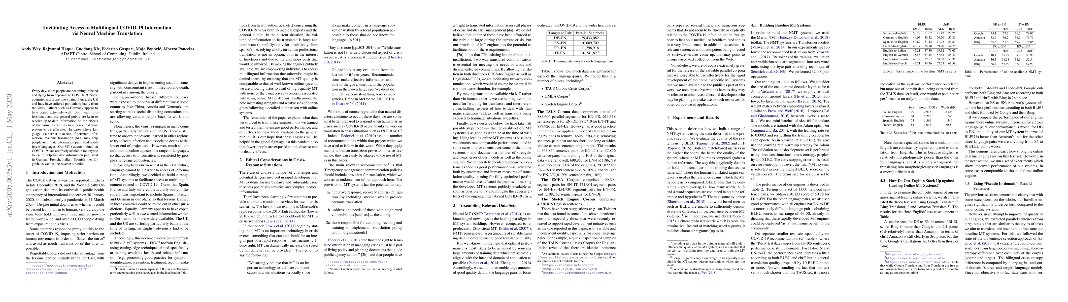 Every day, more people are becoming infected and dying from exposure to COVID-19. Some countries in Europe like Spain, France, the UK and Italy have suffered particularly badly from the virus. Others such as Germany appear to have coped extremely well. Both health professionals and the general public are keen to receive up-to-date information on the effects of the virus, as well as treatments that have proven to be effective. In cases where language is a barrier to access of pertinent information, machine translation (MT) may help people assimilate information published in different languages. Our MT systems trained on COVID-19 data are freely available for anyone to use to help translate information published in German, French, Italian, Spanish into English, as well as the reverse direction.