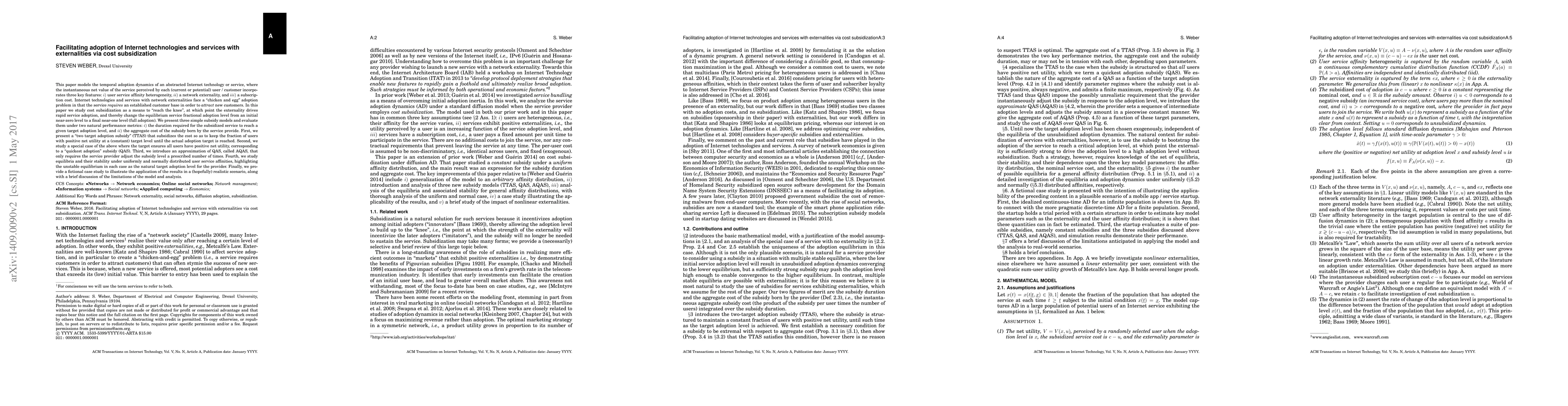 This paper models the temporal adoption dynamics of an abstracted Internet technology or service, where the instantaneous net value of the service perceived by each (current or potential) user / customer incorporates three key features: i) user service affinity heterogeneity, ii) a network externality, and iii) a subscription cost. Internet technologies and services with network externalities face a "chicken and egg" adoption problem in that the service requires an established customer base in order to attract new customers. In this paper we study cost subsidization as a means to "reach the knee", at which point the externality drives rapid service adoption, and thereby change the equilibrium service fractional adoption level from an initial near-zero level to a final near-one level (full adoption). We present three simple subsidy models and evaluate them under two natural performance metrics: i) the duration required for the subsidized service to reach a given target adoption level, and ii) the aggregate cost of the subsidy born by the service provide. First, we present a "two target adoption subsidy" (TTAS) that subsidizes the cost so as to keep the fraction of users with positive net utility at a (constant) target level until the actual adoption target is reached. Second, we study a special case of the above where the target ensures all users have positive net utility, corresponding to a "quickest adoption" subsidy (QAS). Third, we introduce an approximation of QAS, called AQAS, that only requires the service provider adjust the subsidy level a prescribed number of times. Fourth, we study equilibria and their stability under uniformly and normally distributed user service affinities, highlighting the unstable equilibrium in each case as the natural target adoption level for the provider. Finally, we provide a fictional case study to illustrate the results.