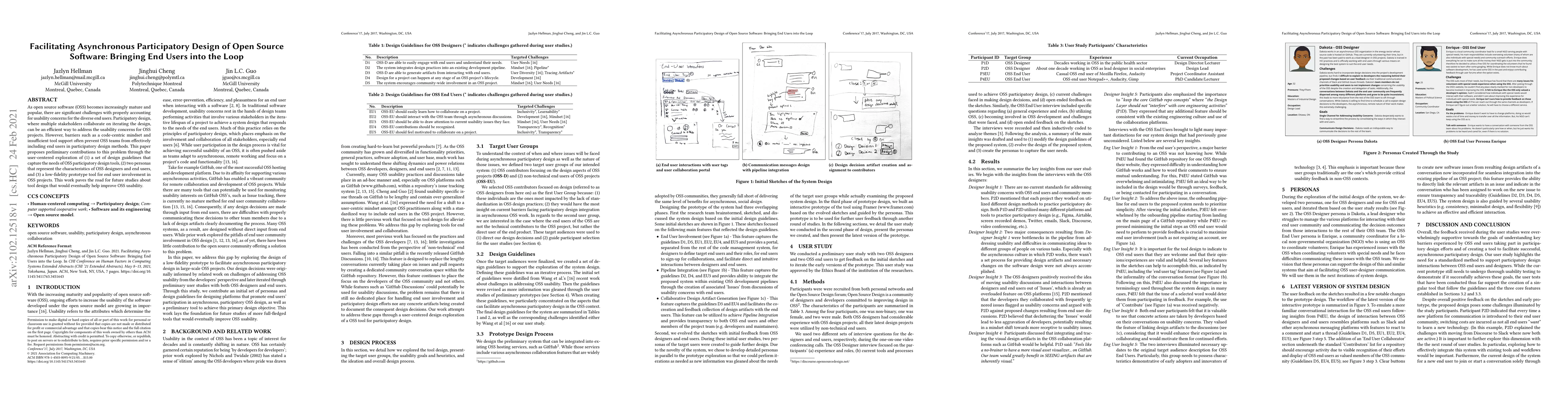 This paper explores participatory design for open source software (OSS) by proposing design guidelines, personas for designers and users, and a low-fidelity prototype tool to enhance end user involvement, aiming to address usability challenges in OSS projects. The work sets the stage for future tool development to improve OSS usability.