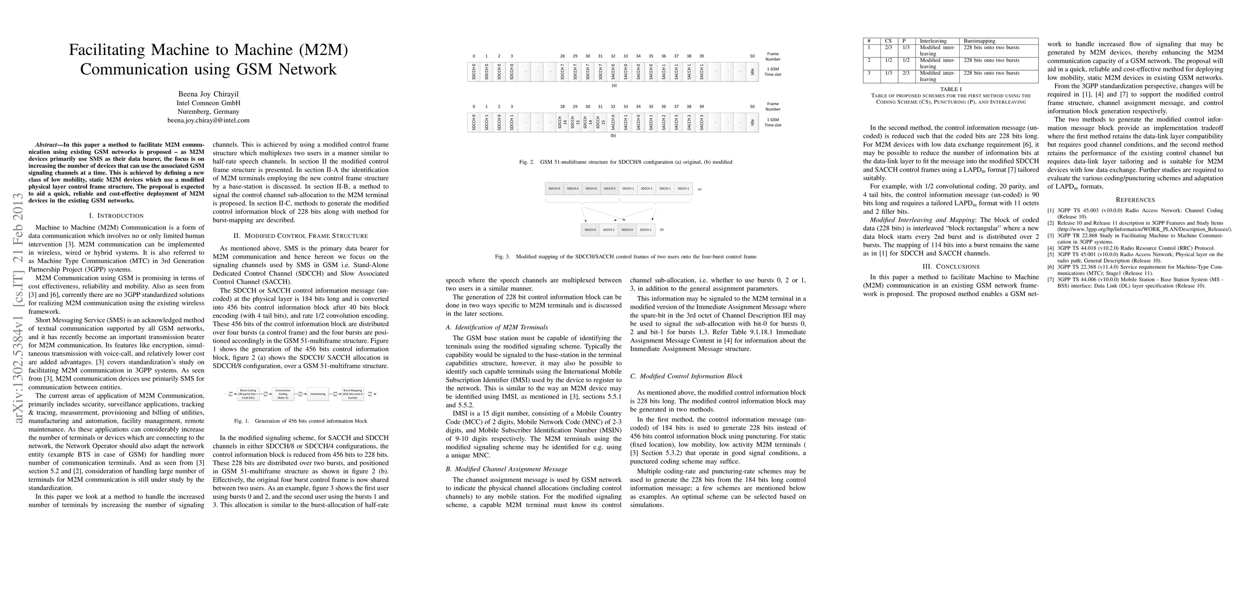 In this paper a method to facilitate M2M communication using existing GSM networks is proposed - as M2M devices primarily use SMS as their data bearer, the focus is on increasing the number of devices that can use the associated GSM signaling channels at a time. This is achieved by defining a new class of low mobility, static M2M devices which use a modified physical layer control frame structure. The proposal is expected to aid a quick, reliable and cost-effective deployment of M2M devices in the existing GSM networks.