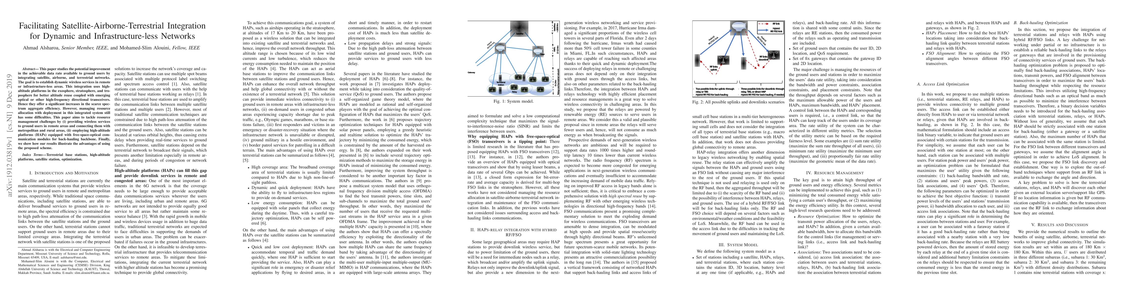 This paper studies the potential improvement in the achievable data rate available to ground users by integrating satellite, airborne, and terrestrial networks. The goal is to establish dynamic wireless services in remote or infrastructure-less areas. This integration uses high-altitude platforms in the exosphere, stratosphere, and troposphere for better altitude reuse coupled with emerging optical or other high-frequency directional transceivers. Hence they offer a significant increases in the scarce spectrum aggregate efficiency. However, managing resource allocation with deployment in this integrated system still has some difficulties. This paper aims to tackle resource management challenges by (i) providing wireless services to ground users in remote areas and connecting them with metropolitan and rural areas, (ii) employing high-altitude platforms (HAPs) equipped with free-space-optical communication modules for back-hauling backbone. Finally, we show how our results illustrate the advantages of using the proposed scheme.