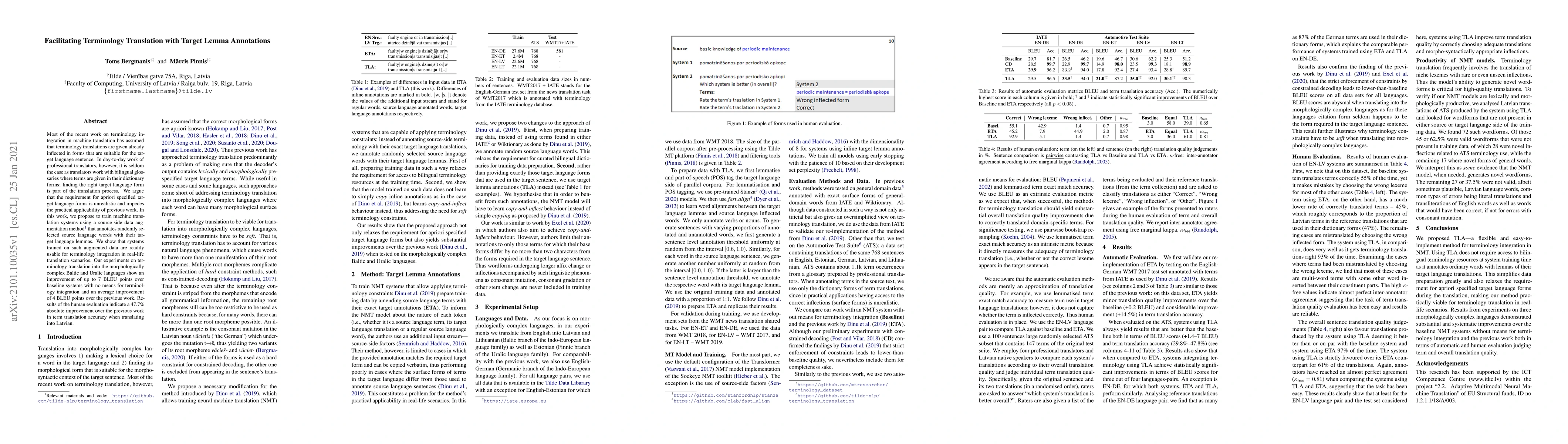 This paper proposes a method to enhance machine translation systems for terminology integration by annotating source language words with their target language lemmas during training. Experiments demonstrate significant improvements in translation accuracy for morphologically complex languages, achieving up to 7 BLEU points better than baseline systems and a notable 47.7% improvement in term translation accuracy for Latvian.