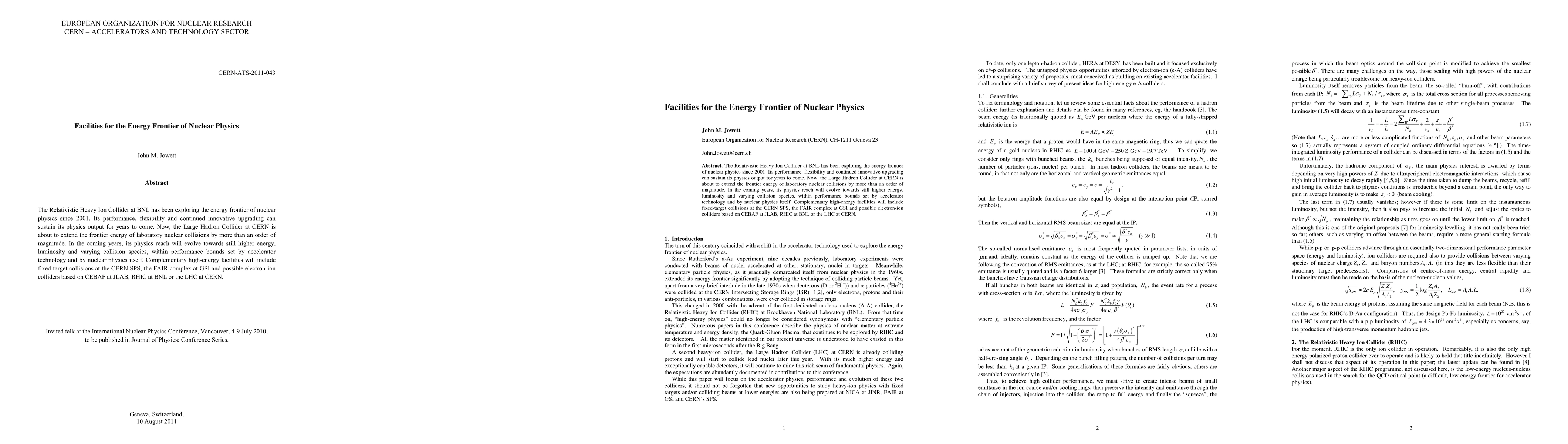 This paper discusses the current and future facilities for exploring the energy frontier of nuclear physics, highlighting the performance of the Relativistic Heavy Ion Collider and the upcoming advancements of the Large Hadron Collider, alongside complementary high-energy projects like the CERN SPS, FAIR, and potential electron-ion colliders.