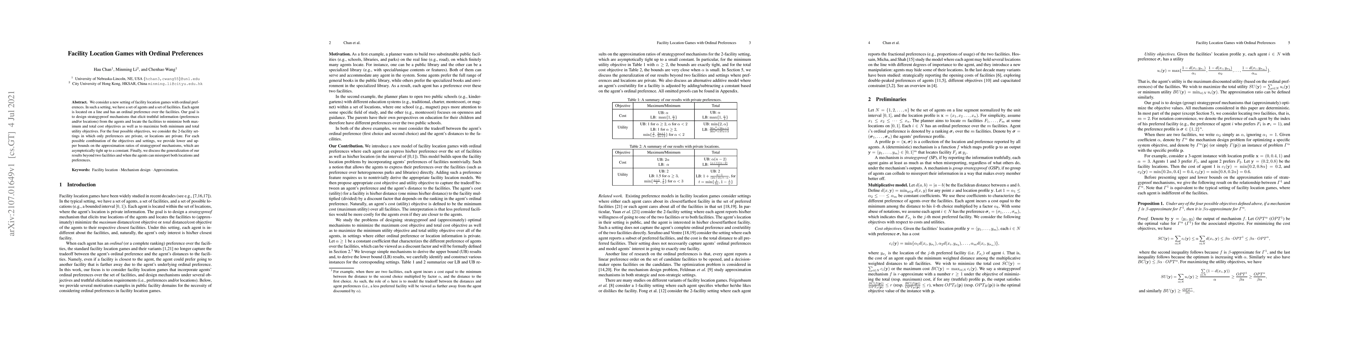 This paper explores facility location games where agents have ordinal preferences over facilities. It aims to design strategyproof mechanisms that elicit truthful information to optimize various cost and utility objectives. The study provides bounds on the approximation ratios for 2-facility settings and discusses generalizations beyond two facilities.