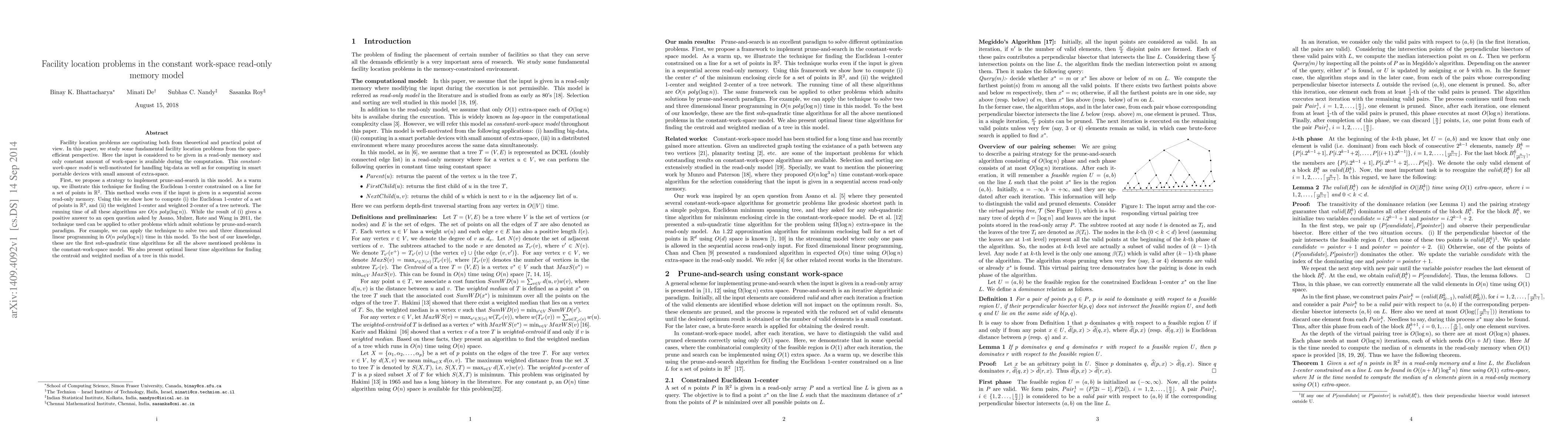 Facility location problems are captivating both from theoretical and practical point of view. In this paper, we study some fundamental facility location problems from the space-efficient perspective. Here the input is considered to be given in a read-only memory and only constant amount of work-space is available during the computation. This {\em constant-work-space model} is well-motivated for handling big-data as well as for computing in smart portable devices with small amount of extra-space. First, we propose a strategy to implement prune-and-search in this model. As a warm up, we illustrate this technique for finding the Euclidean 1-center constrained on a line for a set of points in $\IR^2$. This method works even if the input is given in a sequential access read-only memory. Using this we show how to compute (i) the Euclidean 1-center of a set of points in $\IR^2$, and (ii) the weighted 1-center and weighted 2-center of a tree network. The running time of all these algorithms are $O(n~poly(\log n))$. While the result of (i) gives a positive answer to an open question asked by Asano, Mulzer, Rote and Wang in 2011, the technique used can be applied to other problems which admit solutions by prune-and-search paradigm. For example, we can apply the technique to solve two and three dimensional linear programming in $O(n~poly(\log n))$ time in this model. To the best of our knowledge, these are the first sub-quadratic time algorithms for all the above mentioned problems in the constant-work-space model. We also present optimal linear time algorithms for finding the centroid and weighted median of a tree in this model.
