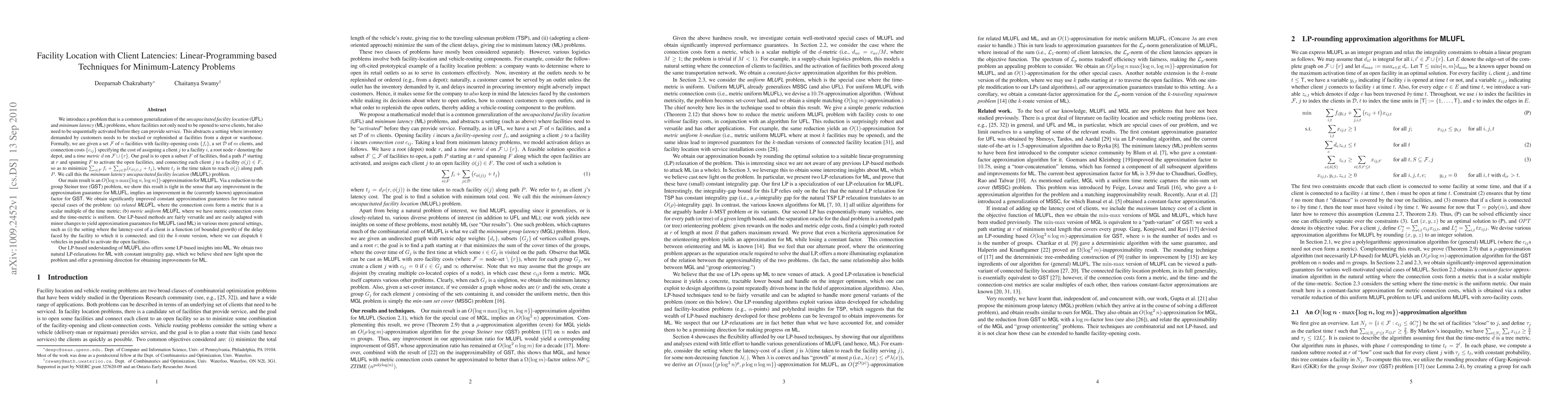 We introduce a problem that is a common generalization of the uncapacitated facility location and minimum latency (ML) problems, where facilities need to be opened to serve clients and also need to be sequentially activated before they can provide service. Formally, we are given a set \F of n facilities with facility-opening costs {f_i}, a set of m clients, and connection costs {c_{ij}} specifying the cost of assigning a client j to a facility i, a root node r denoting the depot, and a time metric d on \F\cup{r}. Our goal is to open a subset F of facilities, find a path P starting at r and spanning F to activate the open facilities, and connect each client j to a facility \phi(j)\in F, so as to minimize \sum_{i\in F}f_i +\sum_{clients j}(c_{\phi(j),j}+t_j), where t_j is the time taken to reach \phi(j) along path P. We call this the minimum latency uncapacitated facility location (MLUFL) problem. Our main result is an O(\log n\max{\log n,\log m})-approximation for MLUFL. We also show that any improvement in this approximation guarantee, implies an improvement in the (current-best) approximation factor for group Steiner tree. We obtain constant approximations for two natural special cases of the problem: (a) related MLUFL (metric connection costs that are a scalar multiple of the time metric); (b) metric uniform MLUFL (metric connection costs, unform time-metric). Our LP-based methods are versatile and easily adapted to yield approximation guarantees for MLUFL in various more general settings, such as (i) when the latency-cost of a client is a function of the delay faced by the facility to which it is connected; and (ii) the k-route version, where k vehicles are routed in parallel to activate the open facilities. Our LP-based understanding of MLUFL also offers some LP-based insights into ML, which we believe is a promising direction for obtaining improvements for ML.