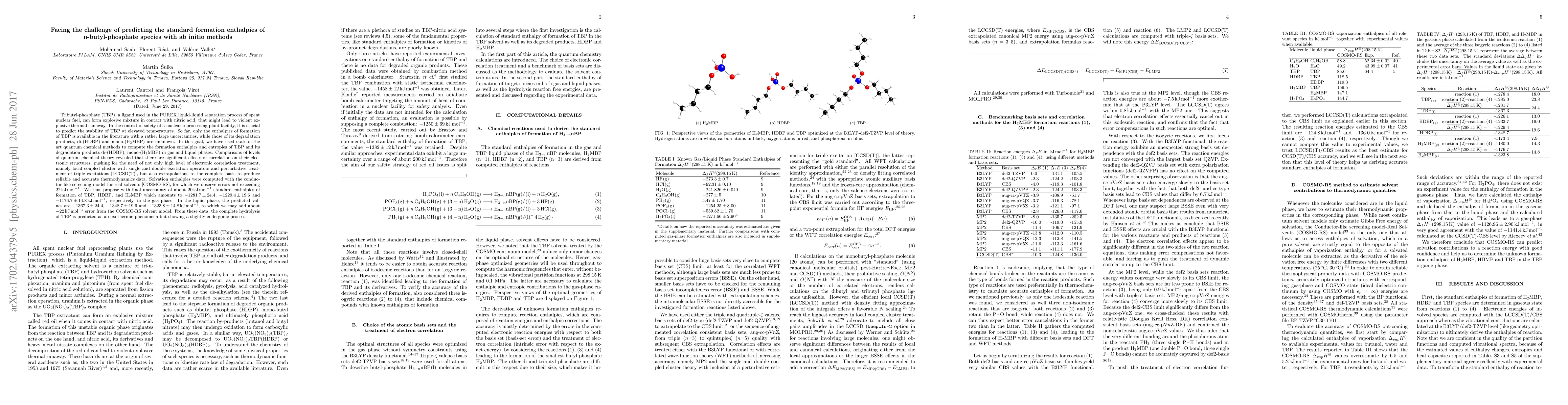 This research uses advanced quantum chemical methods to predict the standard formation enthalpies of tributyl-phosphate (TBP) and its degradation products, di-(HDBP) and mono-(H$_2$MBP), crucial for assessing the safety of nuclear reprocessing plants. The study reports reliable enthalpies with uncertainties of about 20 kJ mol$^{-1}$ in both gas and liquid phases, highlighting the importance of high-level electronic correlation treatments.