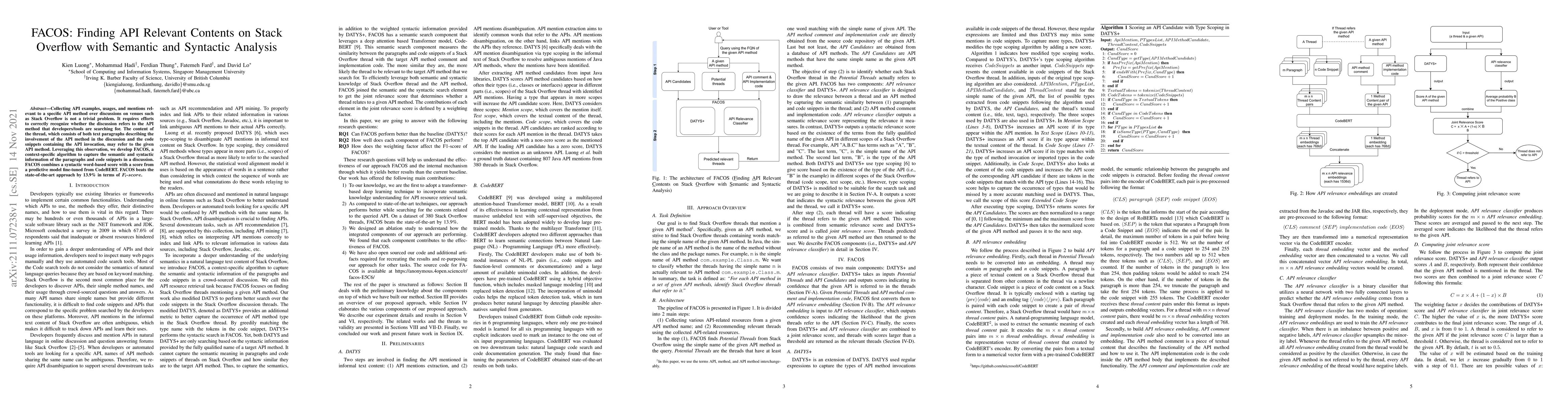 FACOS is an algorithm designed to identify relevant API discussions on Stack Overflow by analyzing both semantic and syntactic content. It outperforms existing methods by 13.9% in F1-score, combining word-based syntax scores with predictive model insights from CodeBERT.