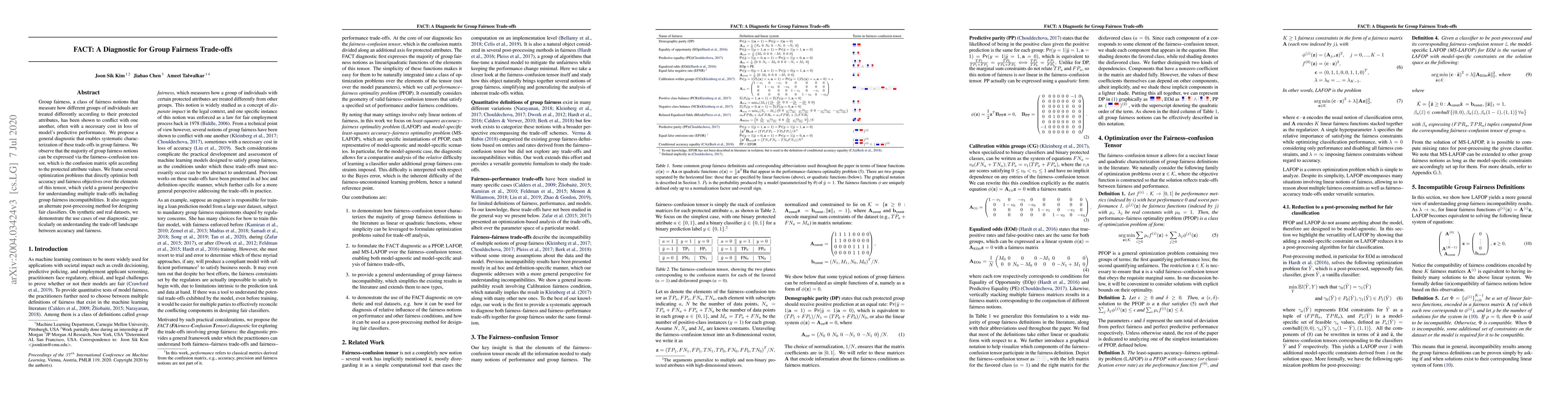 The paper proposes a diagnostic tool called FACT to systematically characterize trade-offs between group fairness and model accuracy. It expresses group fairness notions via the fairness-confusion tensor and frames optimization problems to balance accuracy and fairness, demonstrating its utility on both synthetic and real datasets.