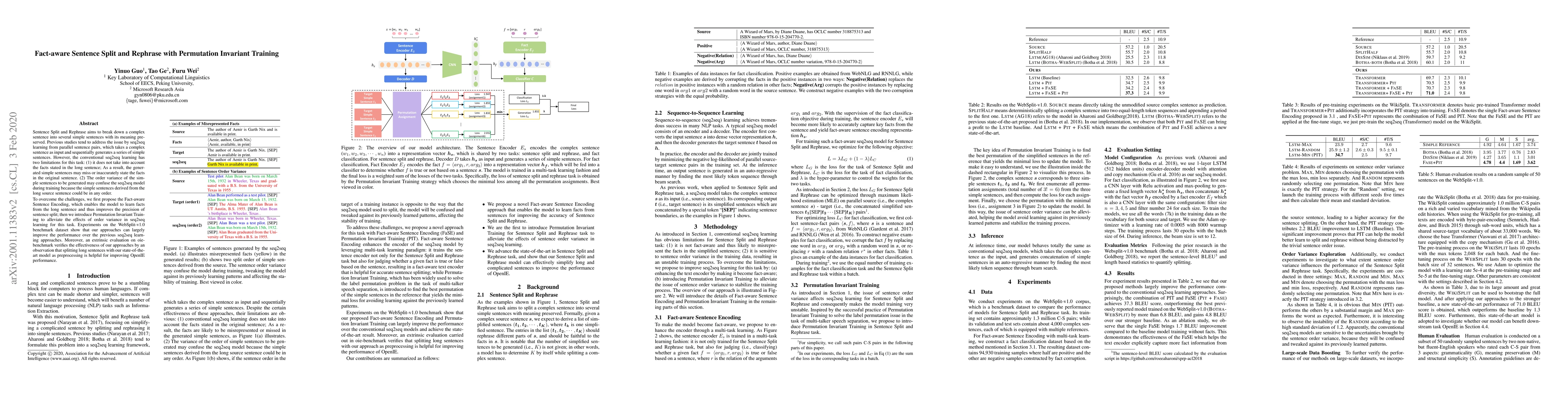 Sentence Split and Rephrase aims to break down a complex sentence into several simple sentences with its meaning preserved. Previous studies tend to address the issue by seq2seq learning from parallel sentence pairs, which takes a complex sentence as input and sequentially generates a series of simple sentences. However, the conventional seq2seq learning has two limitations for this task: (1) it does not take into account the facts stated in the long sentence; As a result, the generated simple sentences may miss or inaccurately state the facts in the original sentence. (2) The order variance of the simple sentences to be generated may confuse the seq2seq model during training because the simple sentences derived from the long source sentence could be in any order. To overcome the challenges, we first propose the Fact-aware Sentence Encoding, which enables the model to learn facts from the long sentence and thus improves the precision of sentence split; then we introduce Permutation Invariant Training to alleviate the effects of order variance in seq2seq learning for this task. Experiments on the WebSplit-v1.0 benchmark dataset show that our approaches can largely improve the performance over the previous seq2seq learning approaches. Moreover, an extrinsic evaluation on oie-benchmark verifies the effectiveness of our approaches by an observation that splitting long sentences with our state-of-the-art model as preprocessing is helpful for improving OpenIE performance.