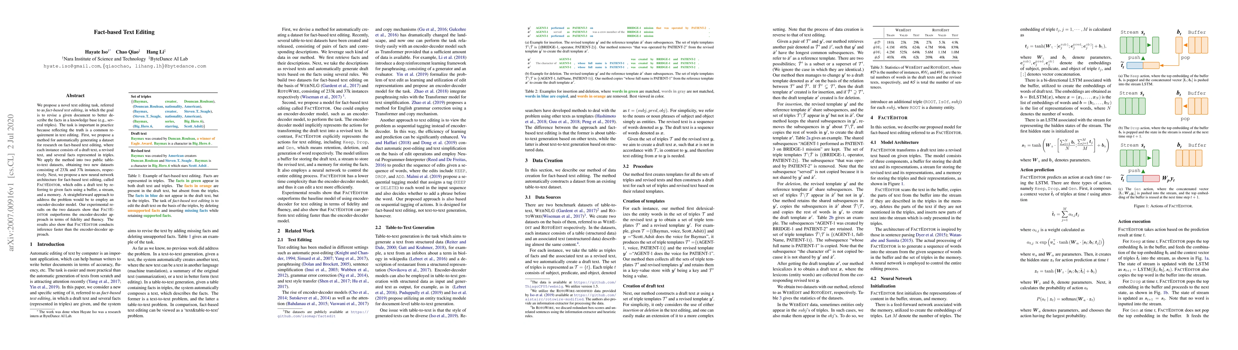 This paper introduces a new text editing task called fact-based text editing, aiming to revise documents to accurately reflect facts from a knowledge base. It proposes a method for generating a large dataset for this task and presents a neural network architecture, FactEditor, which outperforms traditional encoder-decoder models in both accuracy and speed.