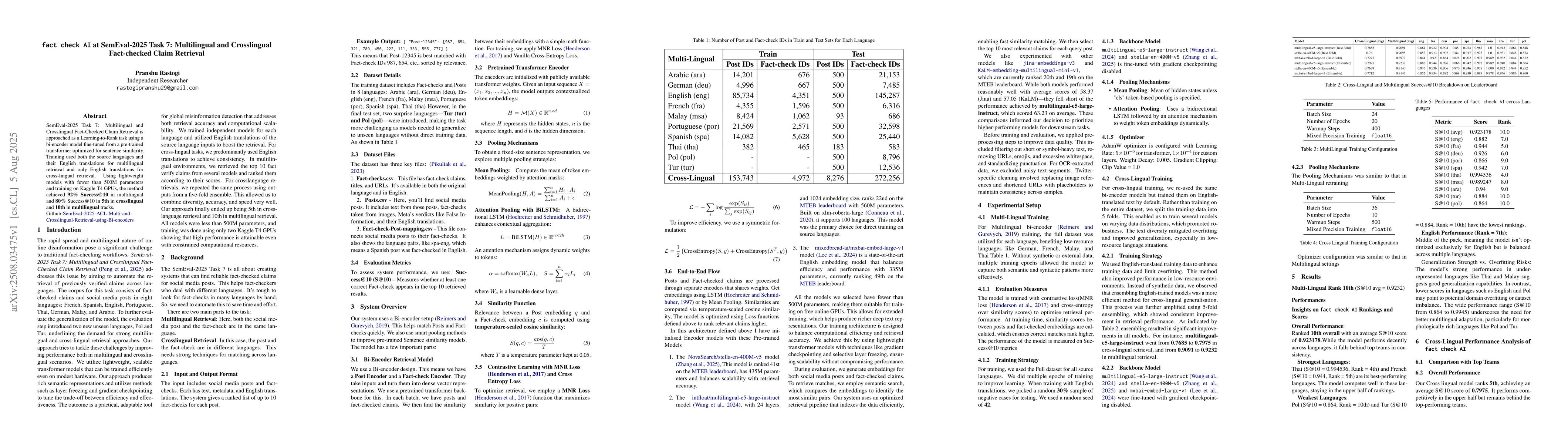 SemEval-2025 Task 7: Multilingual and Crosslingual Fact-Checked Claim Retrieval is approached as a Learning-to-Rank task using a bi-encoder model fine-tuned from a pre-trained transformer optimized for sentence similarity. Training used both the source languages and their English translations for multilingual retrieval and only English translations for cross-lingual retrieval. Using lightweight models with fewer than 500M parameters and training on Kaggle T4 GPUs, the method achieved 92% Success@10 in multilingual and 80% Success@10 in 5th in crosslingual and 10th in multilingual tracks.