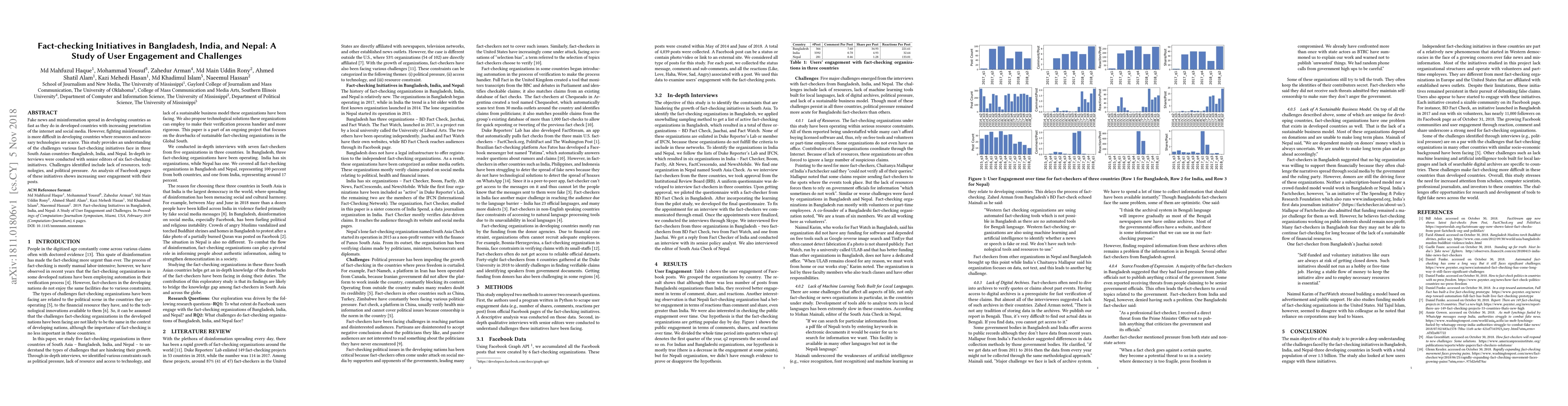 Fake news and misinformation spread in developing countries as fast as they do in developed countries with increasing penetration of the internet and social media. However, fighting misinformation is more difficult in developing countries where resources and necessary technologies are scarce. This study provides an understanding of the challenges various fact-checking initiatives face in three South Asian countries--Bangladesh, India, and Nepal. In-depth interviews were conducted with senior editors of six fact-checking initiatives. Challenges identified include lack of resources, technologies, and political pressure. An analysis of Facebook pages of these initiatives shows increasing user engagement with their posts.