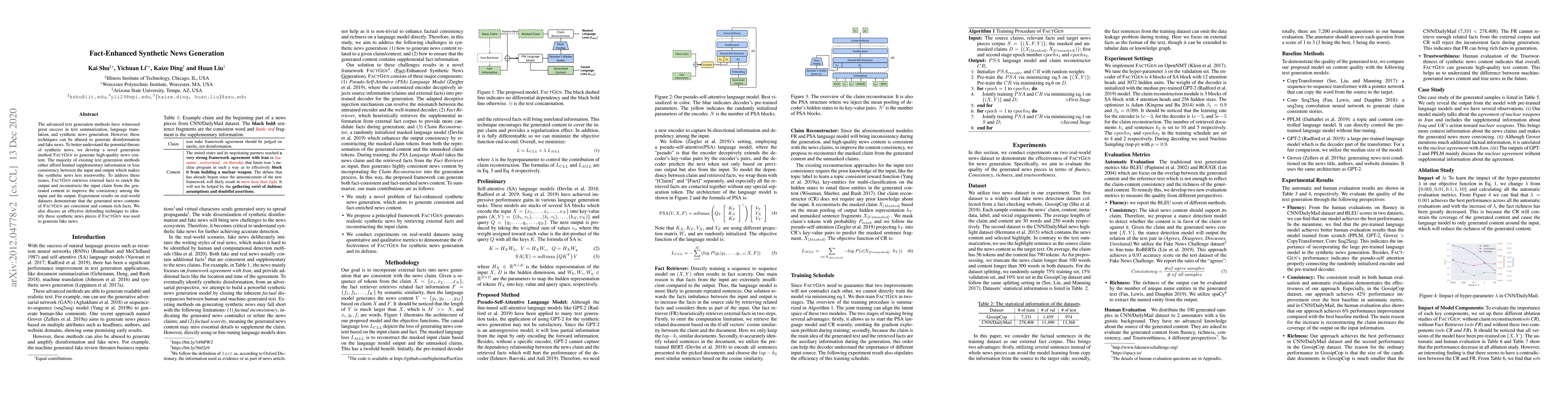 The advanced text generation methods have witnessed great success in text summarization, language translation, and synthetic news generation. However, these techniques can be abused to generate disinformation and fake news. To better understand the potential threats of synthetic news, we develop a new generation method FactGen to generate high-quality news content. The existing text generation methods either afford limited supplementary information or lose consistency between the input and output which makes the synthetic news less trustworthy. To address these issues, FactGen retrieves external facts to enrich the output and reconstructs the input claim from the generated content to improve the consistency among the input and the output. Experiment results on real-world datasets show that the generated news contents of FactGen are consistent and contain rich facts. We also discuss the possible defending method to identify these synthetic news pieces if FactGen is used to generate synthetic news.