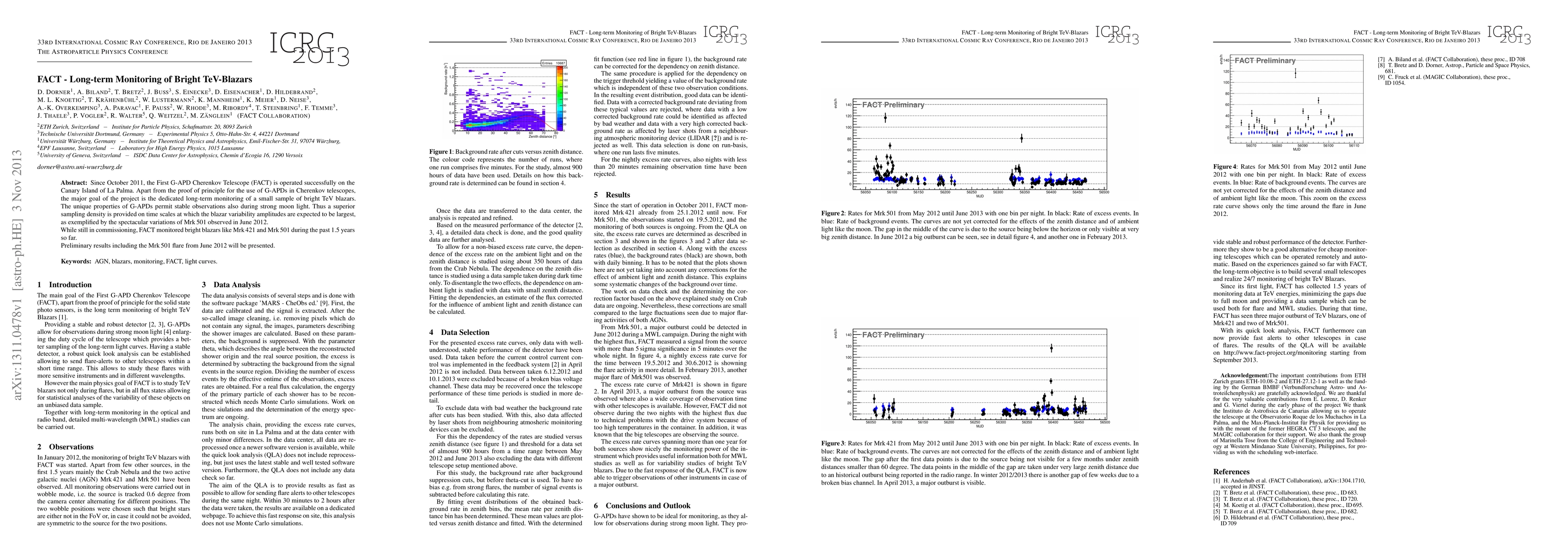 The FACT telescope, operating since 2011 on La Palma, focuses on long-term monitoring of bright TeV blazars, leveraging the unique properties of G-APDs for stable observations even under strong moonlight. Preliminary results highlight significant variability, such as the June 2012 Mrk 501 flare.