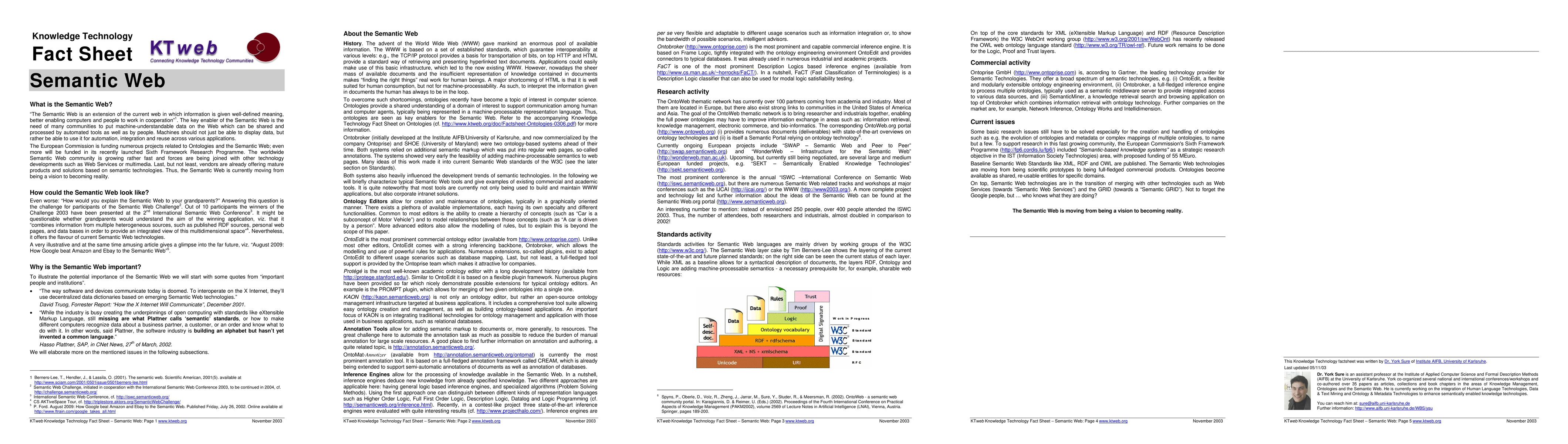 The report gives an overview about activities on the topic Semantic Web. It has been released as technical report for the project "KTweb -- Connecting Knowledge Technologies Communities" in 2003.