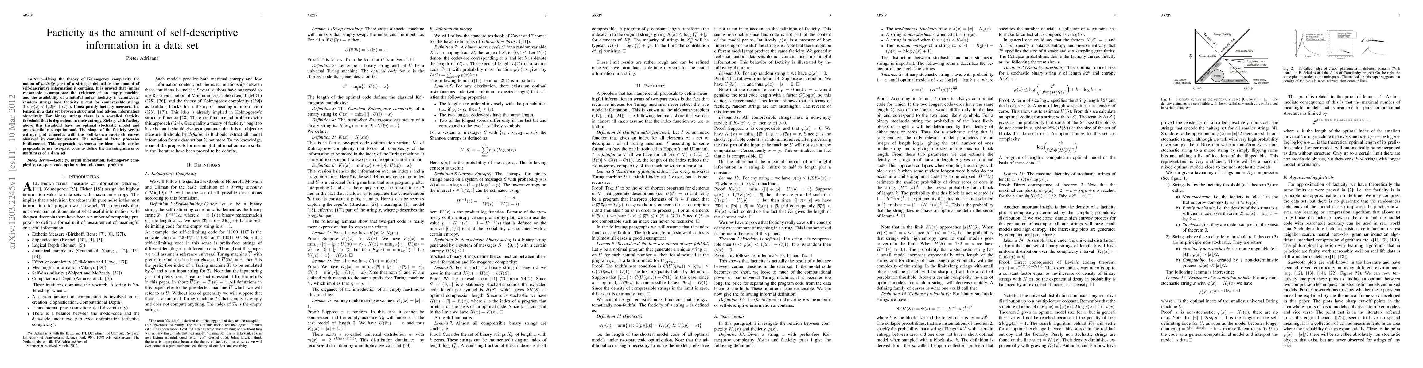 Using the theory of Kolmogorov complexity the notion of facticity {\phi}(x) of a string is defined as the amount of self-descriptive information it contains. It is proved that (under reasonable assumptions: the existence of an empty machine and the availability of a faithful index) facticity is definite, i.e. random strings have facticity 0 and for compressible strings 0 < {\phi}(x) < 1/2 |x| + O(1). Consequently facticity measures the tension in a data set between structural and ad-hoc information objectively. For binary strings there is a so-called facticity threshold that is dependent on their entropy. Strings with facticty above this threshold have no optimal stochastic model and are essentially computational. The shape of the facticty versus entropy plot coincides with the well-known sawtooth curves observed in complex systems. The notion of factic processes is discussed. This approach overcomes problems with earlier proposals to use two-part code to define the meaningfulness or usefulness of a data set.